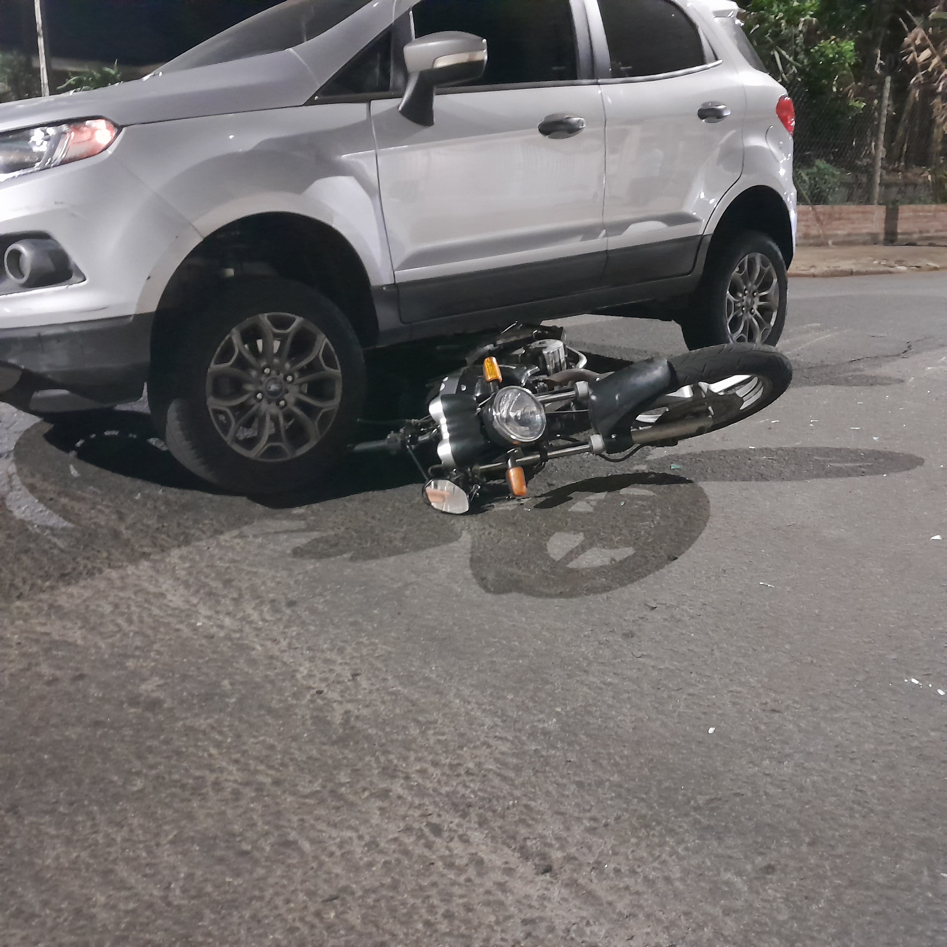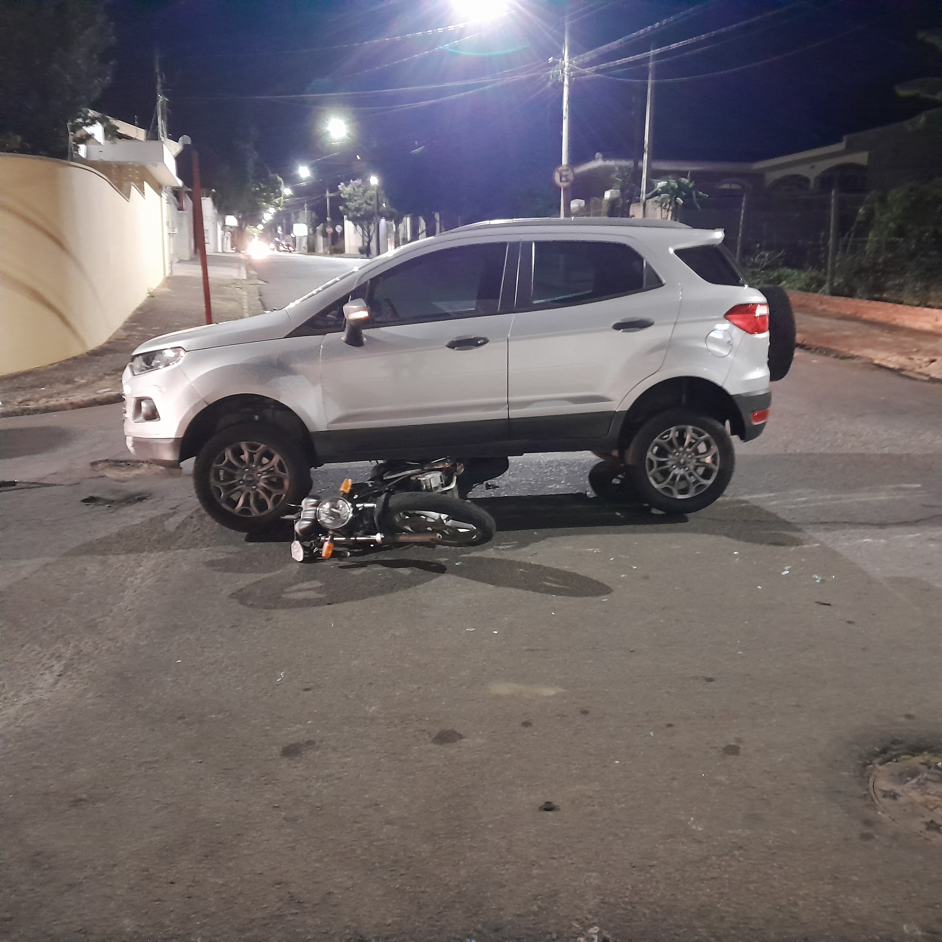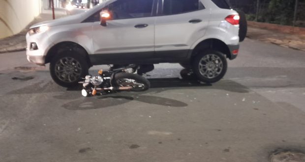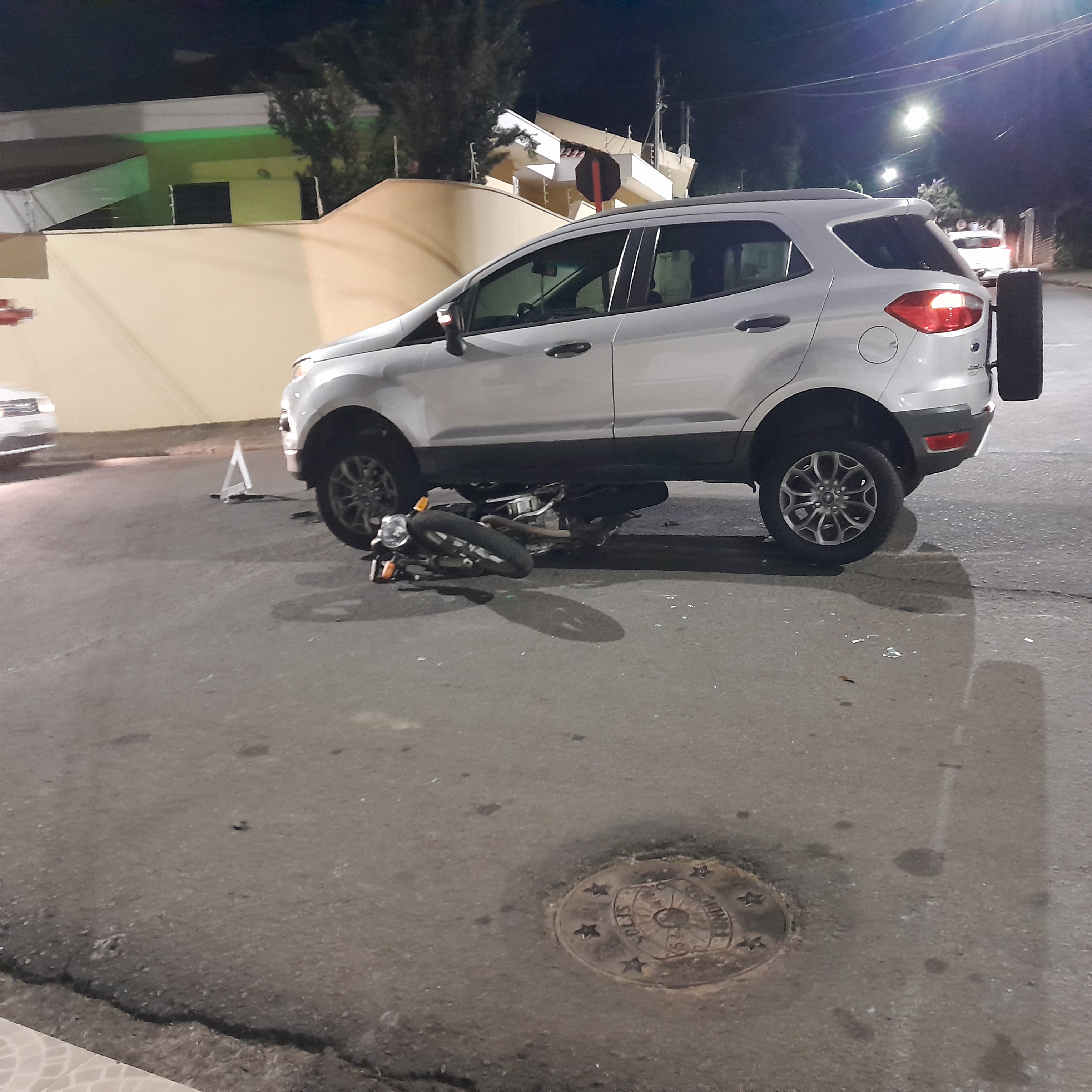 Uma moto parou debaixo de um carro nesta noite de sábado, 29/07/2023, na Rua Conde do Pinhal, cruzamento com a Rua Maria Isabel de Oliveira Botelho, bairro Vila Nery, São Carlos-SP.