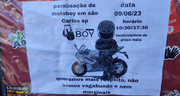 Os motoboys de São Carlos-SP e também de todo o Brasil, em busca de melhorias, estão se organizando para uma paralisação no dia 09-06, das 10h30 até as 17h30. De acordo com informações, eles querem melhorias. Em São Carlos, a concentração vai ser na Praça Itália. Depois eles irão sair pelas ruas.