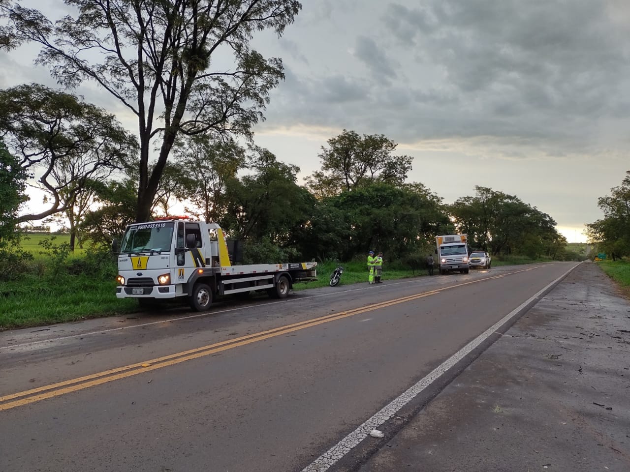 Um motociclista foi socorrido no final da tarde de quinta-feira, 10-12-2020, após ser atingido por um galho de árvore no km 156 da SP-215, São Carlos-SP.