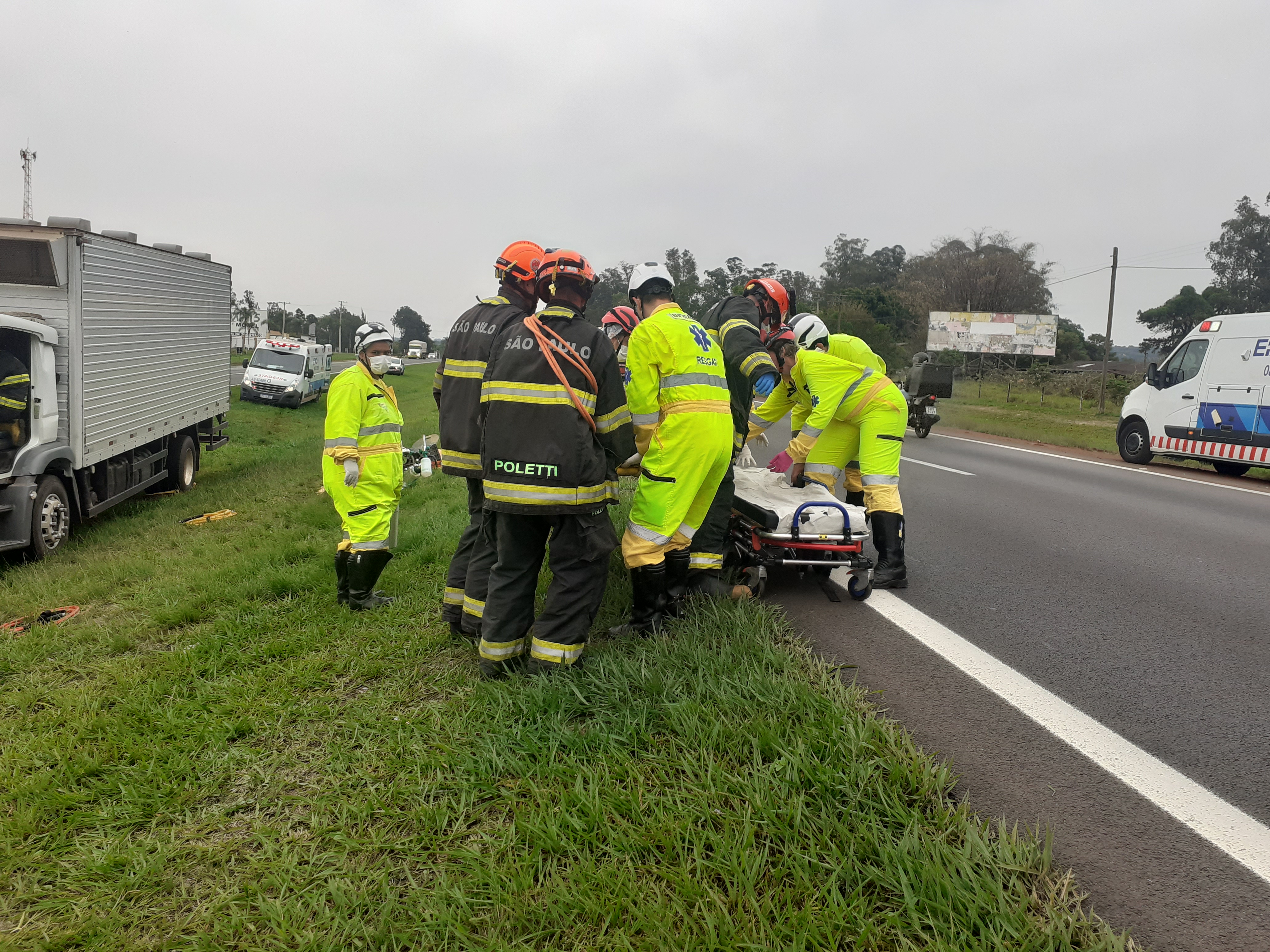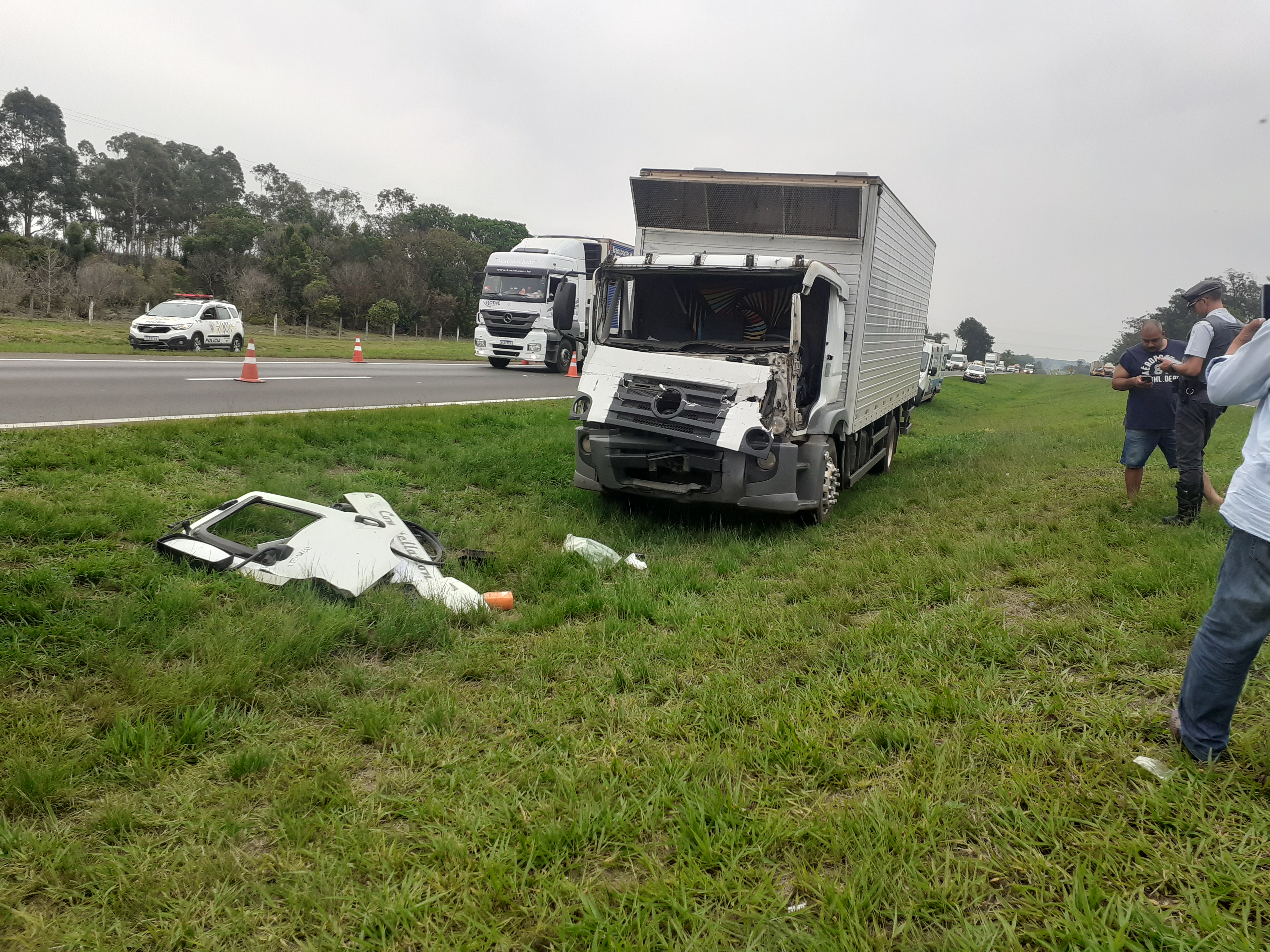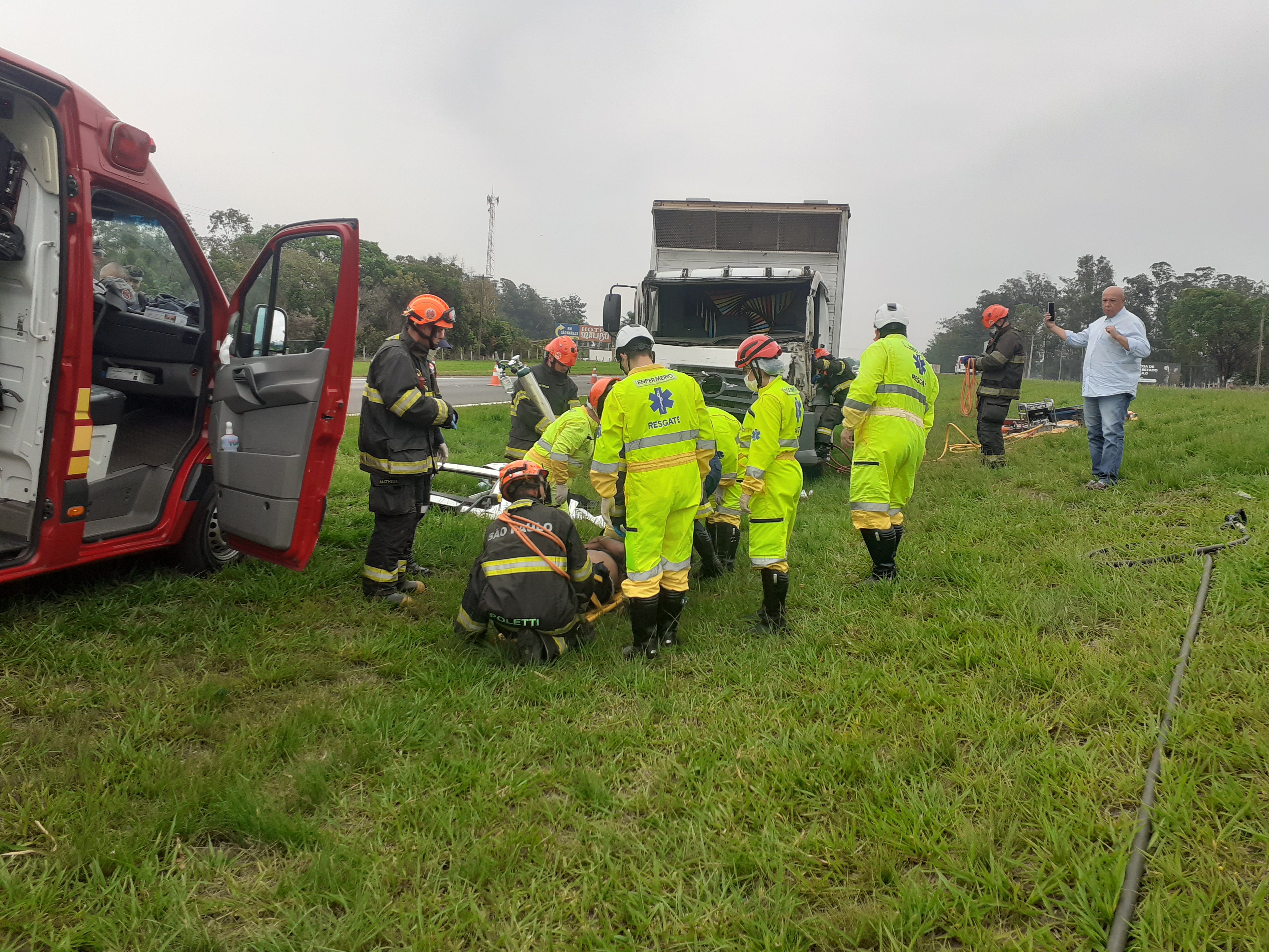 De acordo com informações, L.RC, de 26 anos, transitava com seu caminhão no sentido São Carlos/capital, por motivos desconhecidos colidiu na traseira de uma Scania carregada com açúcar. Após o acidente , o caminhão baú saiu da pista e parou no canteiro central. O Corpo de Bombeiros, concessionária e uma equipe do SAMU de Araraquara, que passava pelo local tiveram muito trabalho para retirar a vítima das ferragens. O motorista sofreu fratura na perna direita e foi encaminhado para a Santa Casa de São Carlos. O motorista da Scania nada sofreu. A Polícia Militar Rodoviária esteve e tomou as medidas cabíveis.