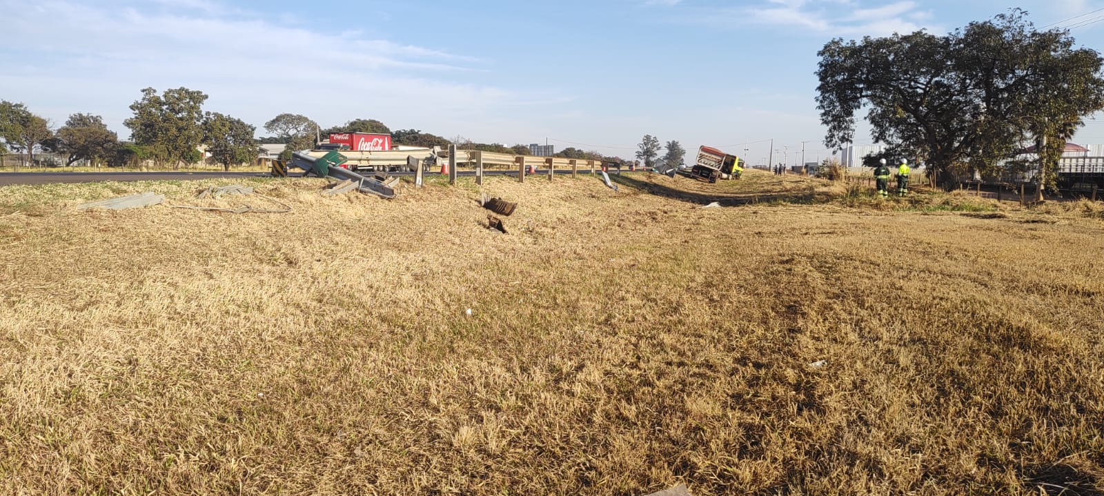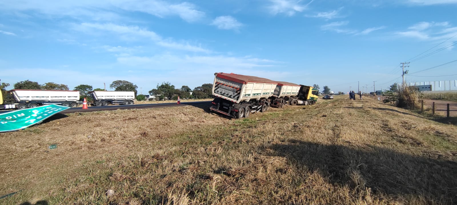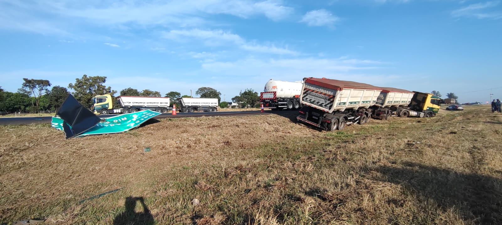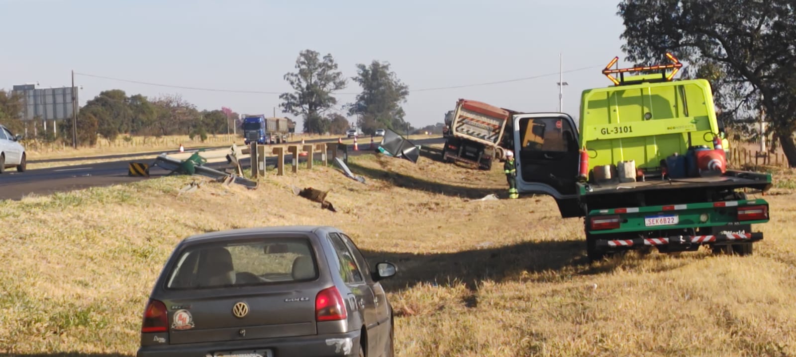 Segundo informações, o homem de 46 anos, conduzi a o bitrem, perdeu o controle da direção, saiu da pista, colidiu na defensa metálica e arrancou uma placa de sinalização.