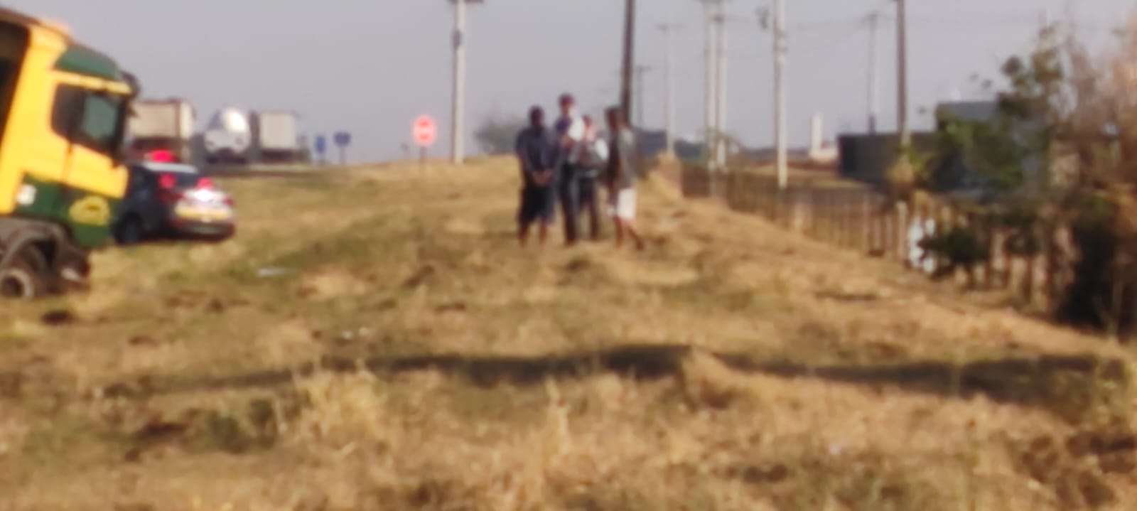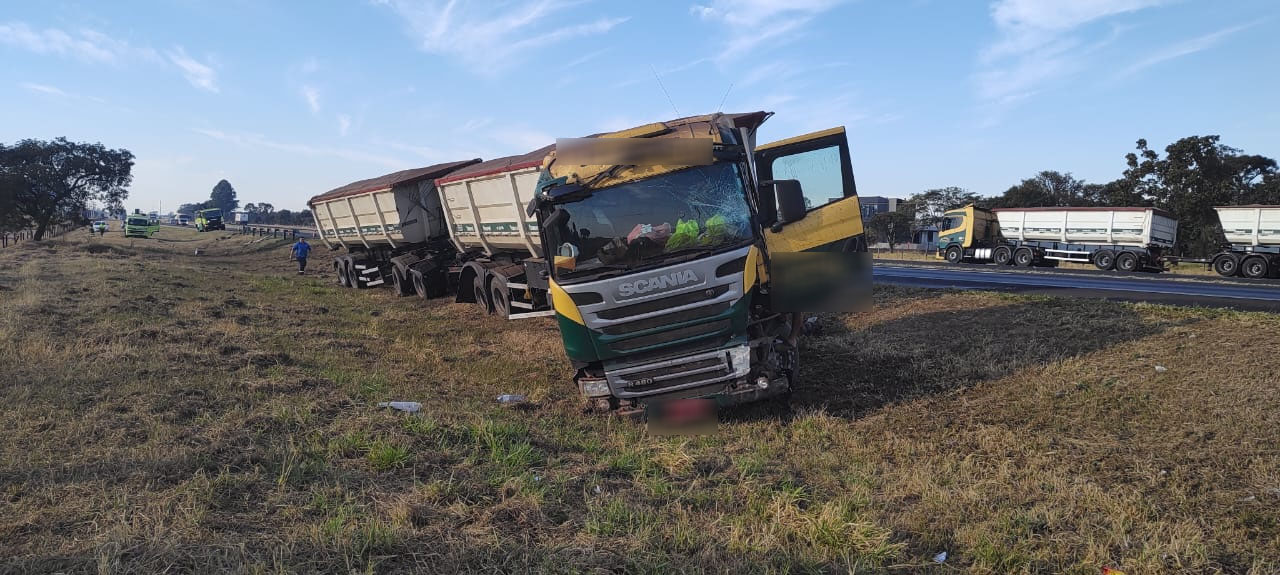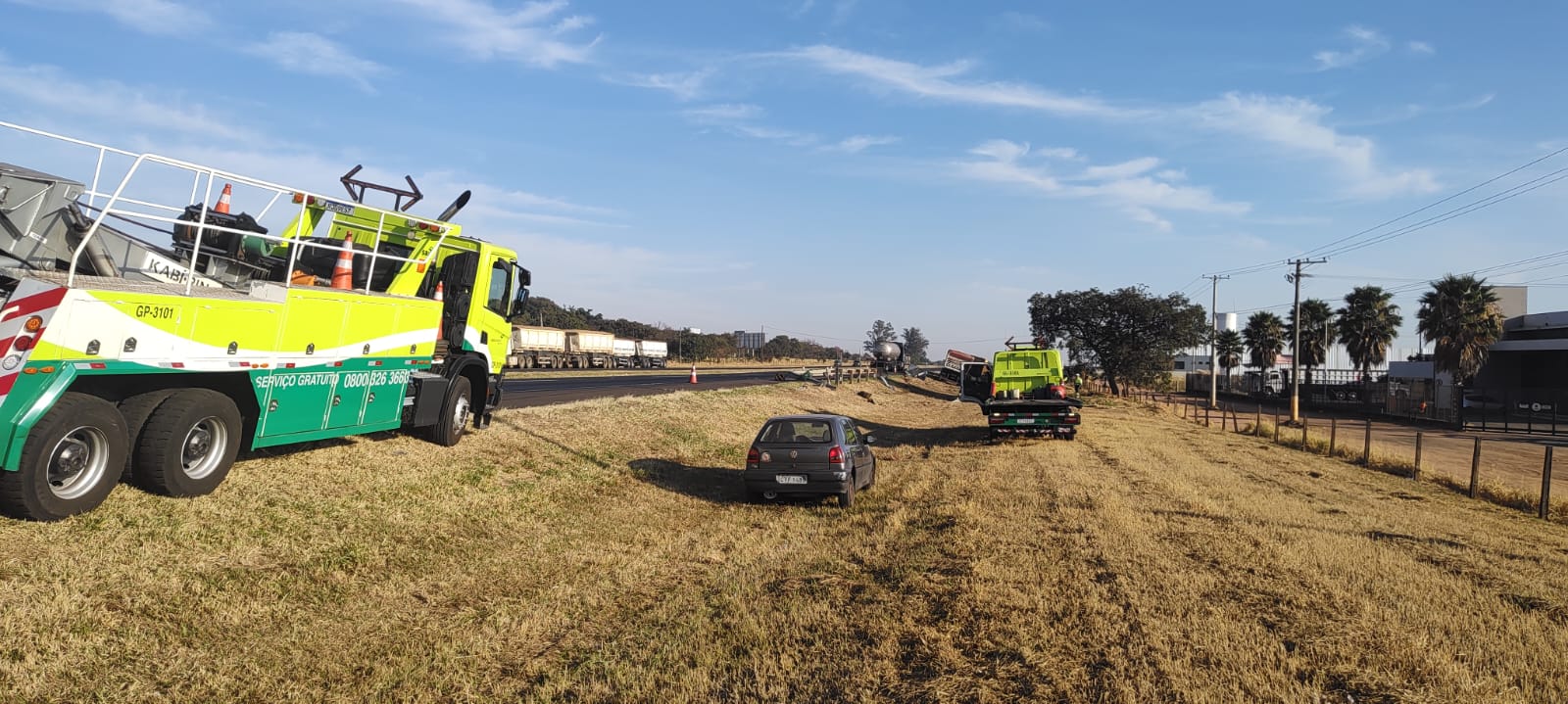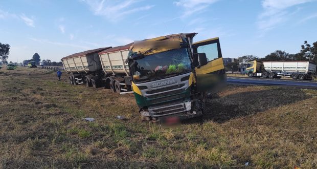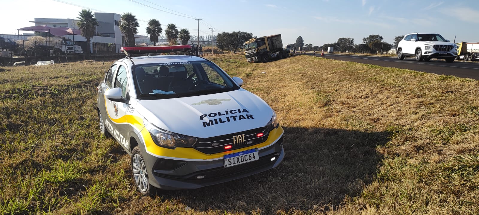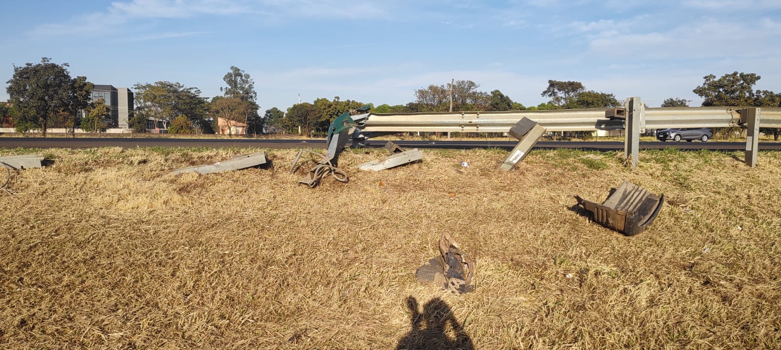 Segundo informações, o homem de 46 anos, conduzi a o bitrem, perdeu o controle da direção, saiu da pista, colidiu na defensa metálica e arrancou uma placa de sinalização.