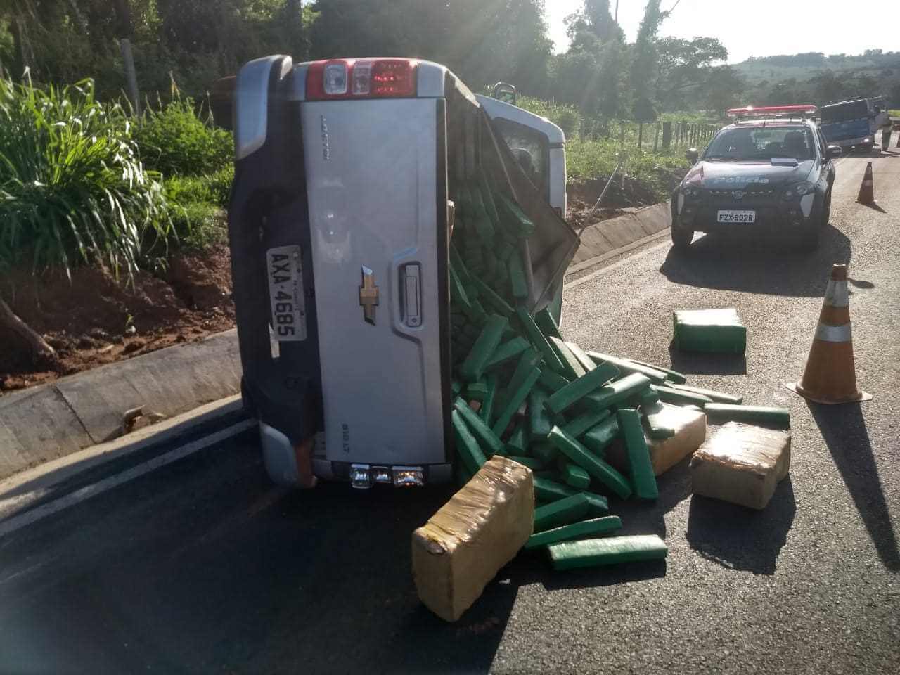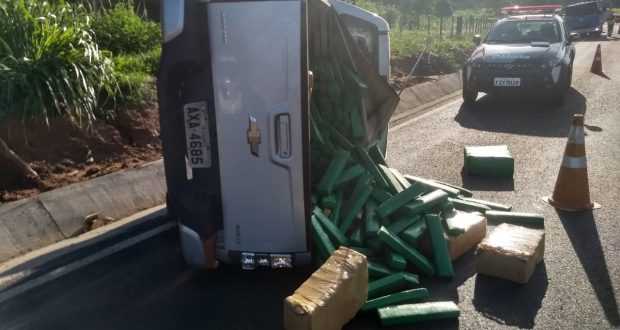 Quase no mesmo momento, a polícia rodoviária recebeu um comunicado de um capotamento na Rodovia Feliciano Salles Cunha, em Poloni. Ao chegar ao local, o motorista havia fugido, mas foi abordado pelos policiais alguns quilômetros a frente. Mais de uma tonelada de maconha era transportada na carroceria de uma caminhonete, onde no acidente, parte da carga ficou espalhada da pista. O motorista seguia no sentido Nhandeara a Monte Aprazível, quando capotou.