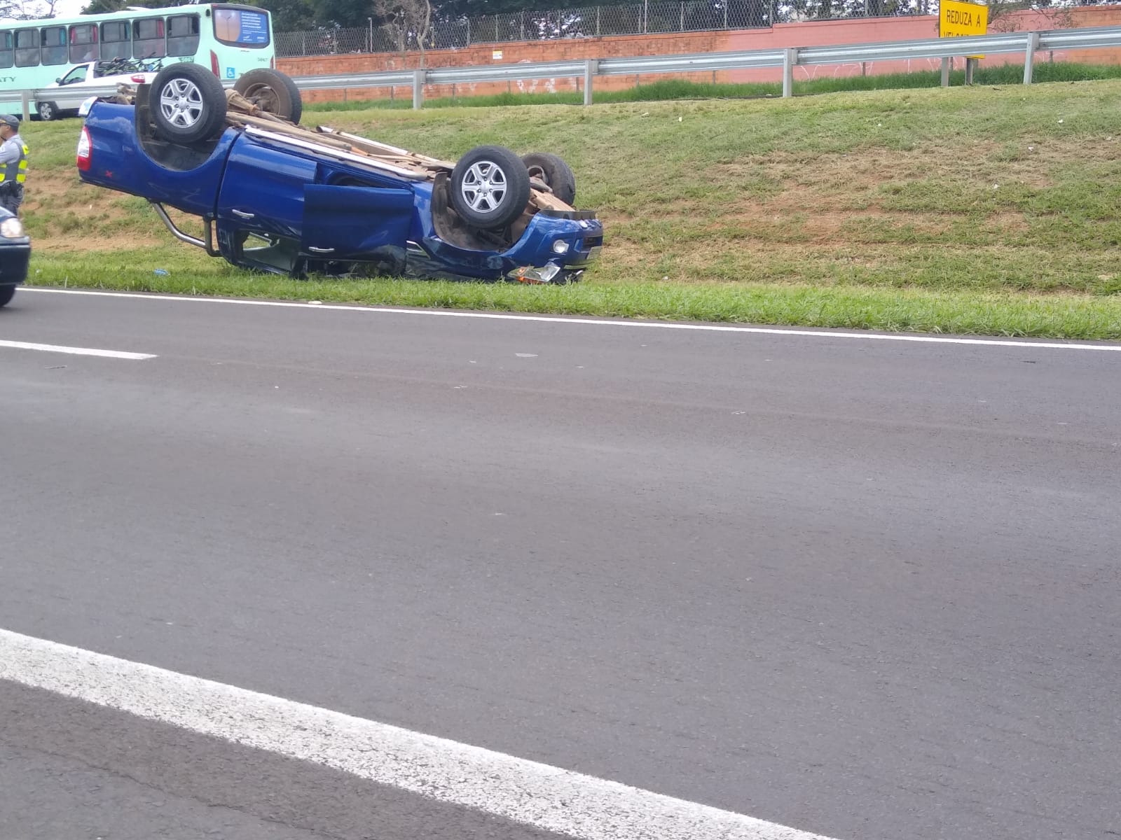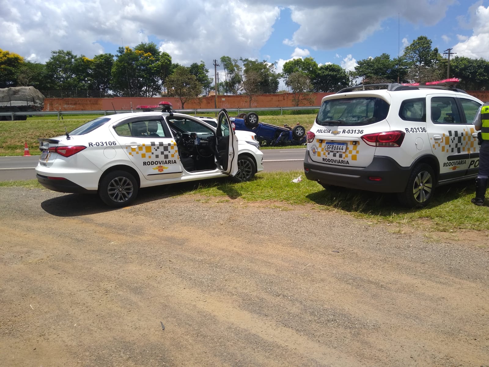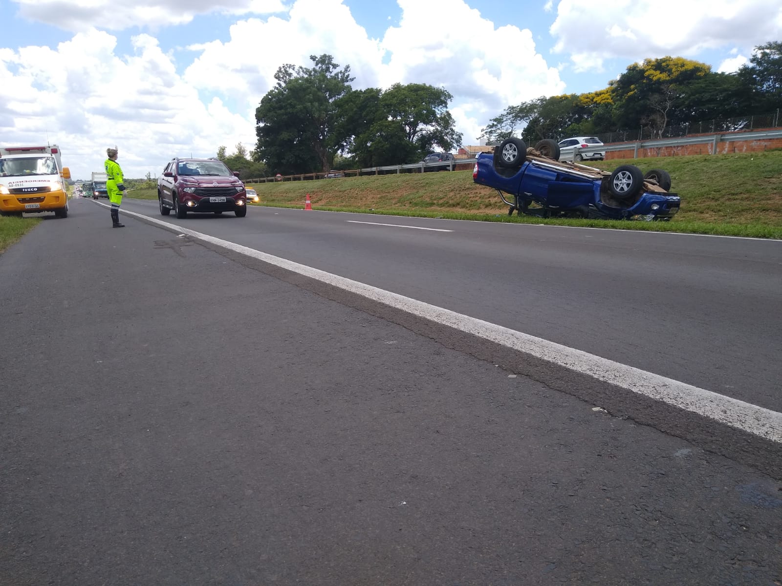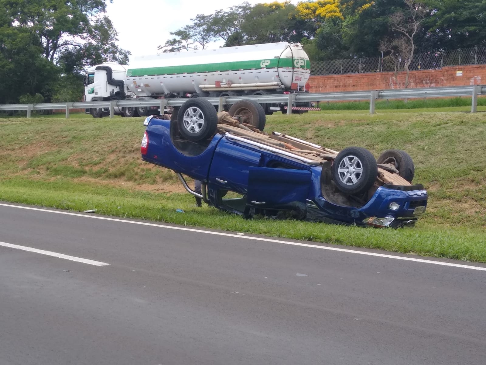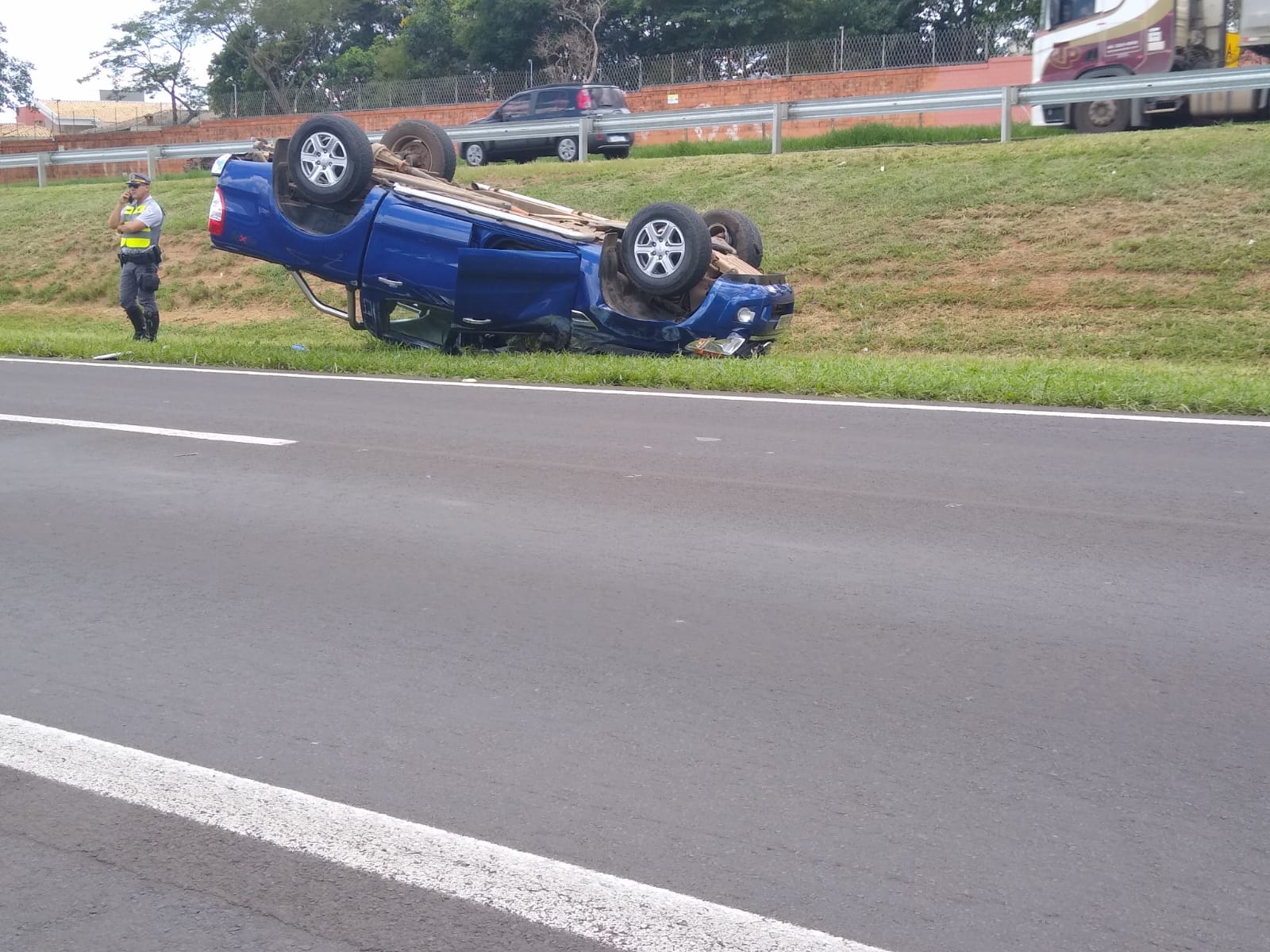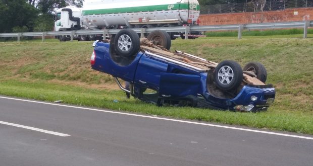 Uma caminhonete capotou nesta tarde de quarta-feira, 22 de dezembro de 2021, após sua condutora colidir na traseira de um caminhão Volvo no km 240 da rodovia Washington Luís, São Carlos-SP (entre o bairro Jóquei Clube e o Jd. Embaré).