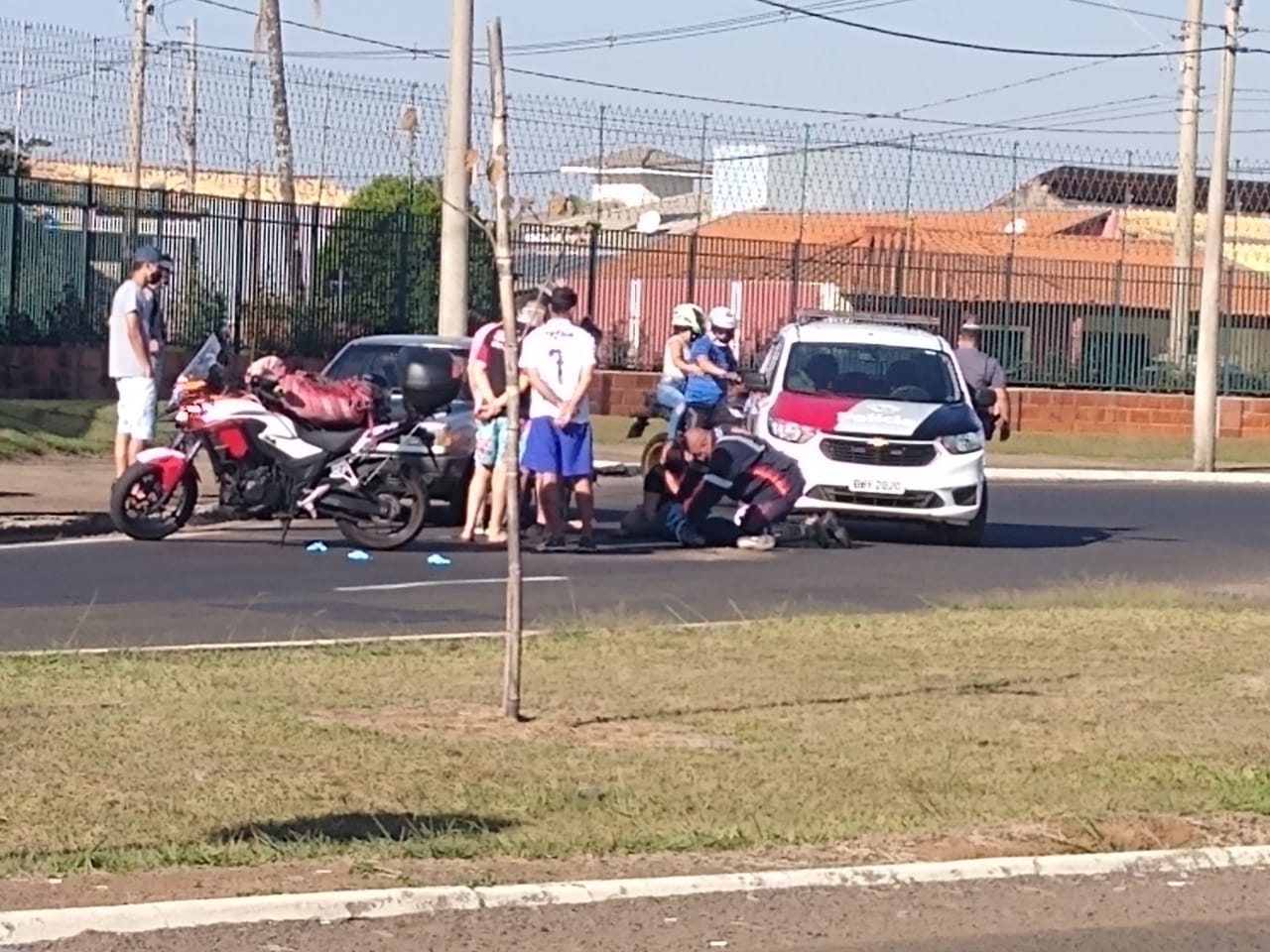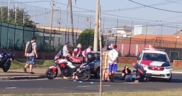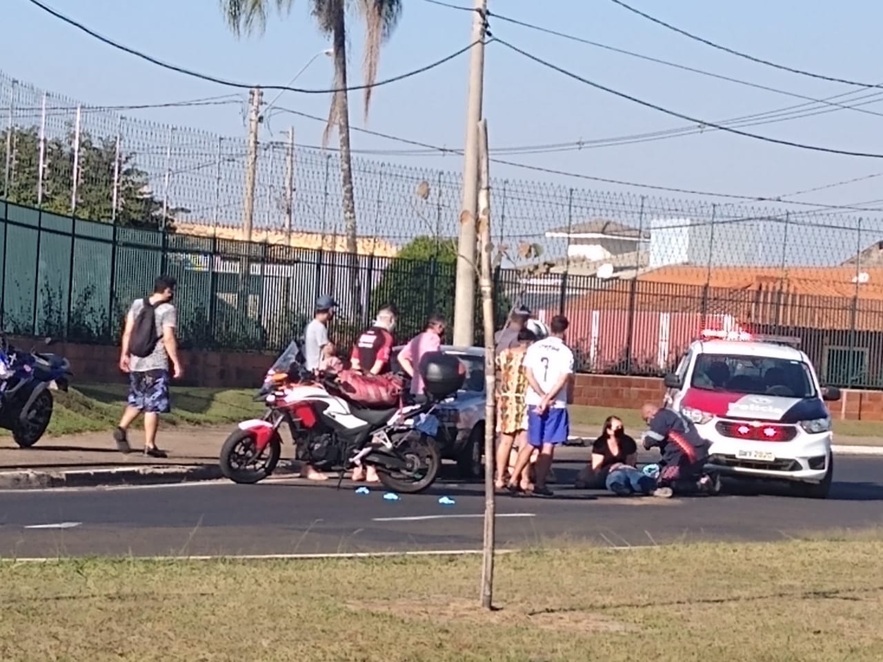 Uma motociclista sofreu uma fratura fechada nesta tarde de domingo, 19-07-2020, ao se envolver em um acidente de trânsito na Avenida Miguel Petroni, Regiao da UNICEP, São Carlos-SP.