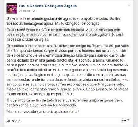 O jornalista Paulo Roberto Rodrigues Zagallo, de 28 anos, neto do ex-técnico de futebol Mário Jorge Zagallo, está internado no Centro e Tratamento Intensivo (CTI) do Hospital Pasteur, no Méier, Zona Norte do Rio de Janeiro. Segundo Paulo Jorge Zagallo, pai do jovem, o filho foi vítima de uma tentativa de assalto, por volta das 3:00 da manhã deste domingo, 14-05-2017. quando passava pela Rua Isidro de Figueiredo, na Tijuca, também na Zona Norte.