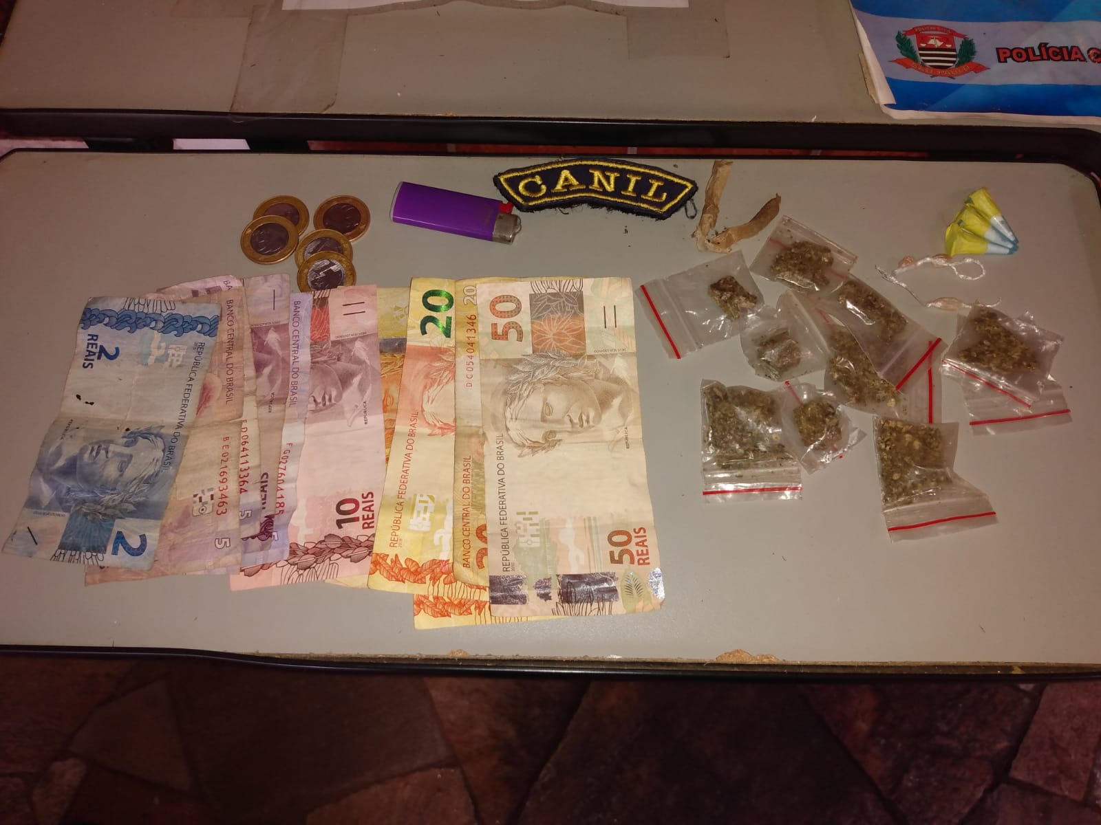 Segundo informações, o Canil  da GM estava em patrulhamento preventivo ao passar por um campo de futebol,  ao lado da CEMEI Maria Alice Vaz de Macedo, avistou um  indivíduo, que ao notar a presença da viatura, empreendeu fuga. O menor de 14 anos jogou no chão um invólucro preto contendo 03 pinos de  cocaína, 10 invólucros de maconha, 03 pedras de crack,  01 cigarro de maconha fixado atrás da orelha e R$ 172,00 reais em espécie.  O menor e os objetos apreendidos foram encaminhados à DISE,  o adolescente ficou à disposição da família e os objetos apreendidos.