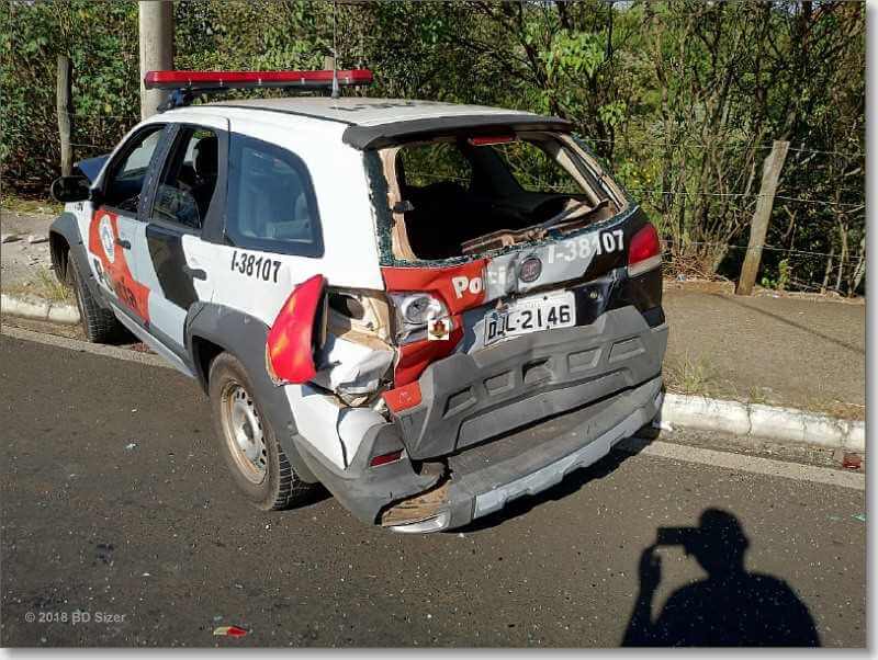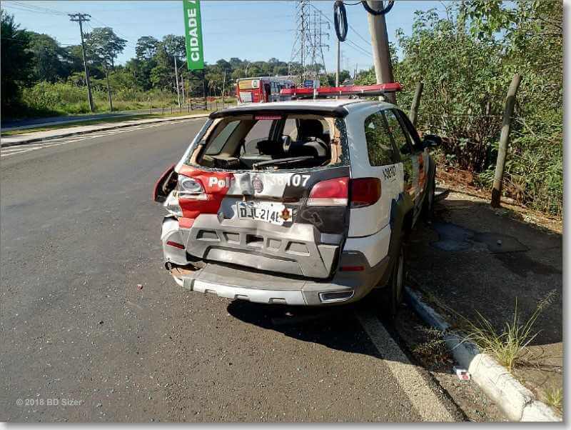 Uma viatura da PM ficou completamente destruída nesta manhã de segunda-feira, 14 de maio de 2018, ao ser atingida por um coletivo da empresa Suzantur na Avenida Integração, região sul de São Carlos-SP.