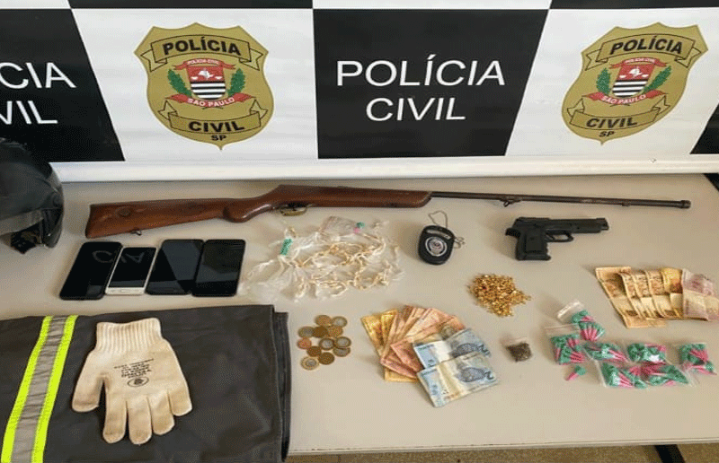 A ação visa o combate a roubos, furtos, receptação e tráfico de drogas que ocorrem no município e região Após investigações realizadas pelo Setor de Investigações da Delegacia de Ribeirão Bonito/SP o qual também contou com informações repassadas pelo Comando da Polícia Militar local, foi detectada a presença de uma quadrilha que conta com indivíduos residentes em Ribeirão Bonito e São Carlos, sendo que os mesmos praticaram recentemente um roubo a residencia e um outro a um comercio (farmácia) em Ribeirão Bonito; além, de atuarem no comércio de entorpecentes, furtos e receptação de produtos ilícitos. Durante as diligências os policiais localizaram e apreenderam 119 pedras de Crack, 63 micro tubos de cocaína, 01 papelote de maconha; R$ 329,10 ; 01 arma de fogo do tipo espingarda; 01 simulacro de arma de fogo do tipo pistola; 04 aparelhos de telefonia celular, 01 Tablet, 166 brincos (roubados recentemente de um comércio) 02 capacetes, 01 luva, 02 e uma motocicleta ( utilizados pelos meliantes na prática dos roubos); foram presos em flagrante delito duas mulheres residentes em Ribeirão Bonito e um homem residente na cidade de São Carlos. As investigações prosseguem.