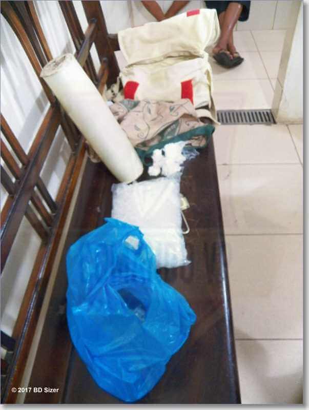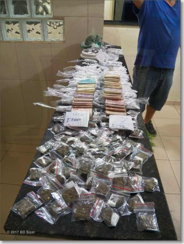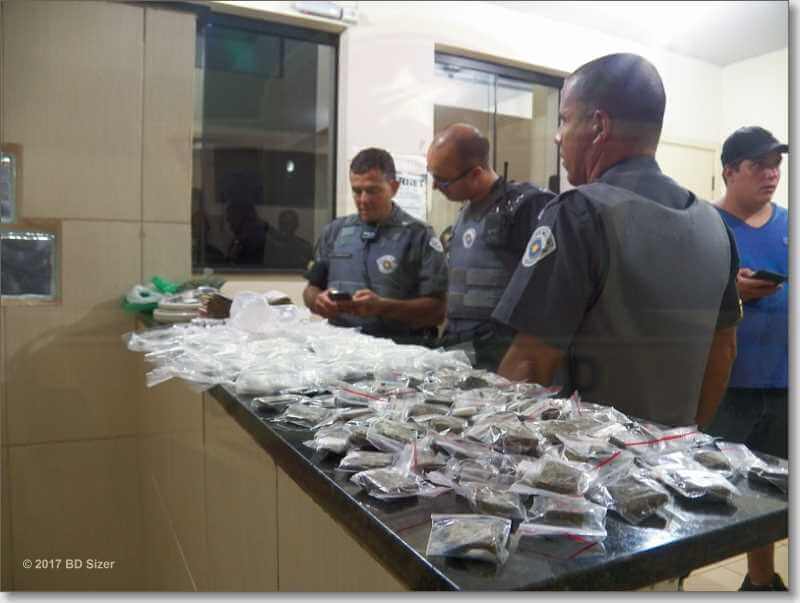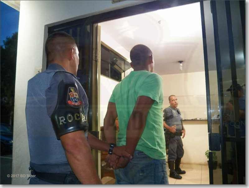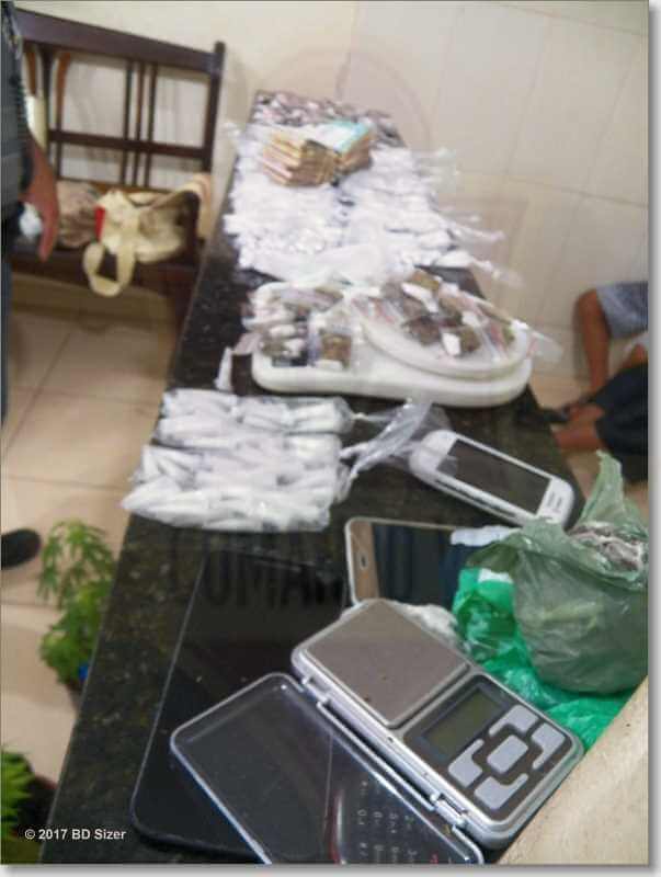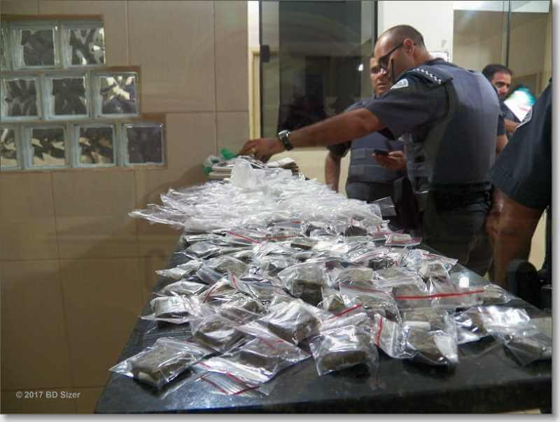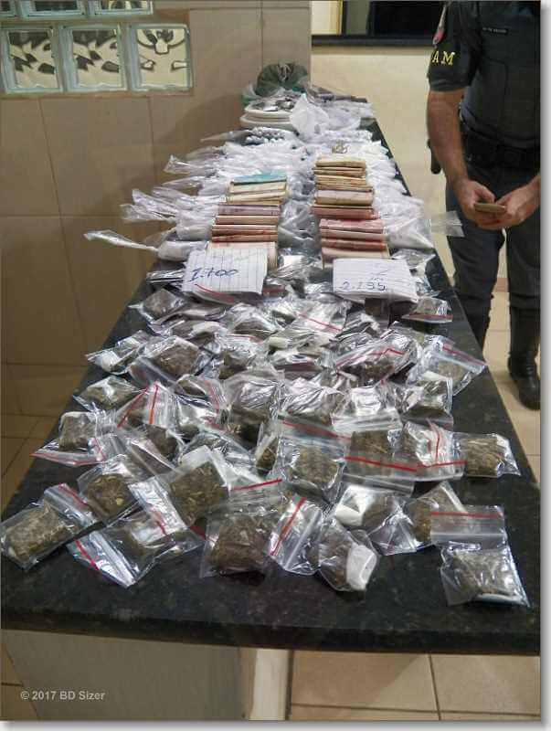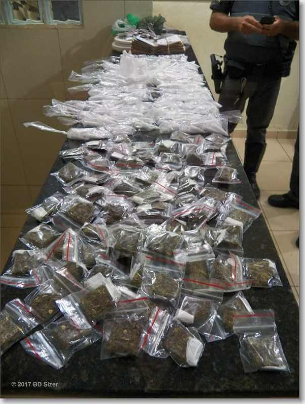 Ainda de acordo com B.O, um dos suspeitos de tráfico era Gabriel Augusto Perez da Silva, de 25 anos, profissão pintor, morador no condomínio II, bloco3. E foi para lá que parte da tropa se deslocou. Os policiais encontraram a porta do apartamento aberta. Os PMs da ROCAM adentraram ao apartamento e encontraram o suspeito deitado na cama. No seu bolso foi localizado um pino de pó branco semelhante a cocaína. Na gaveta da cômoda do quarto foram localizados 22 pequenas porções de erva semelhante a maconha e 56 pinos com pó branco semelhante a cocaína. O averiguado disse ser usuário de drogas e por isso tinha aquela quantidade em seu apartamento. Ele foi indagado onde estava a chave do cadeado do local onde fica guardado o botijão de gás, mas disse que não sabia. Os PMs têm conhecimento que às vezes drogas são guardadas na casinha do gás. Sendo assim eles continuaram buscar pela chave do cadeado e acabaram localizando duas chaves. Neste momento o suspeito confessou que as chaves eram da casa do gás de seu apartamento. Sendo assim o soldado da PM William abriu o tal cadeado e acabou localizando mais quatro centos e seis (406) pinos com substancia semelhante a cocaína, 130 pedras de crack, aproximadamente 1.400 pinos vazios , 79 porções de maconha, uma balança de precisão e um rolo de embalagem filme PVC. O indiciado negou que tais objetos lhe pertenciam. Gabriel Augusto foi encaminhado ao Plantão Policial, autuado em flagrante por tráfico de drogas e recolhido ao Centro de Triagem de São Carlos. Foi apreendida também a quantia de R$ 3.685, 00.