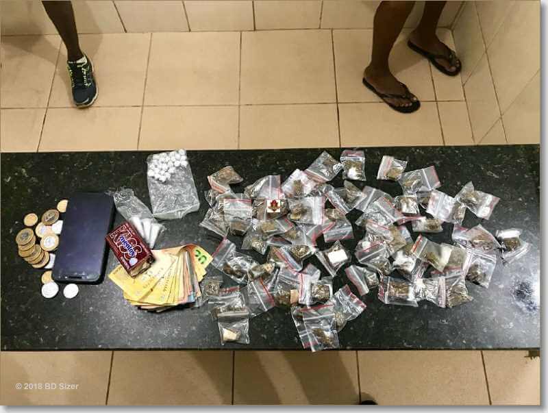 O sargento Adans, soldados Marcos e Lopes abordaram o jovem de 17 anos no condomínio Dois e com o mesmo foram localizadas 60 trouxinhas de maconha, 23 pedras de crack, 03 pinos de cocaína e R$ 265,00.