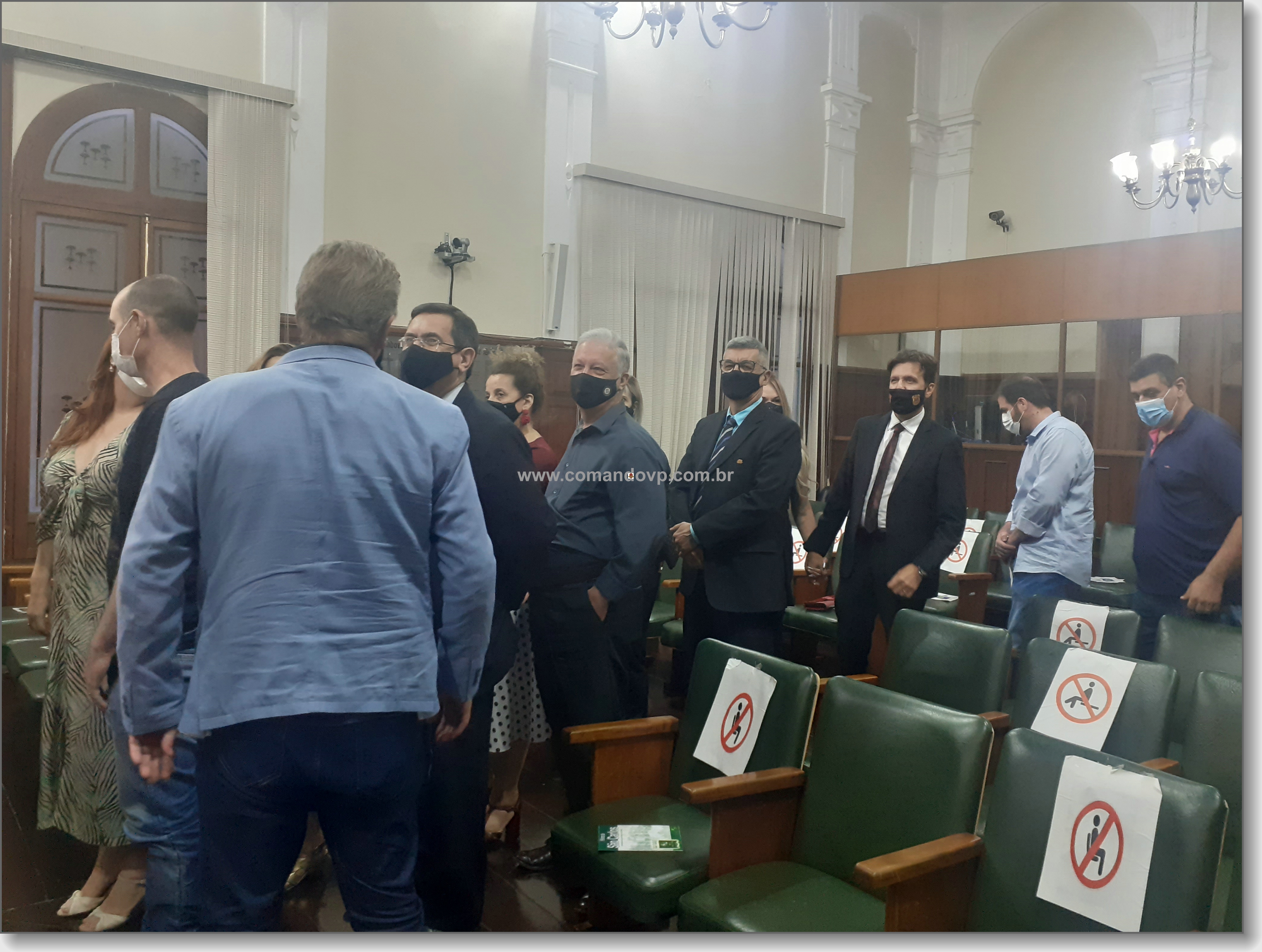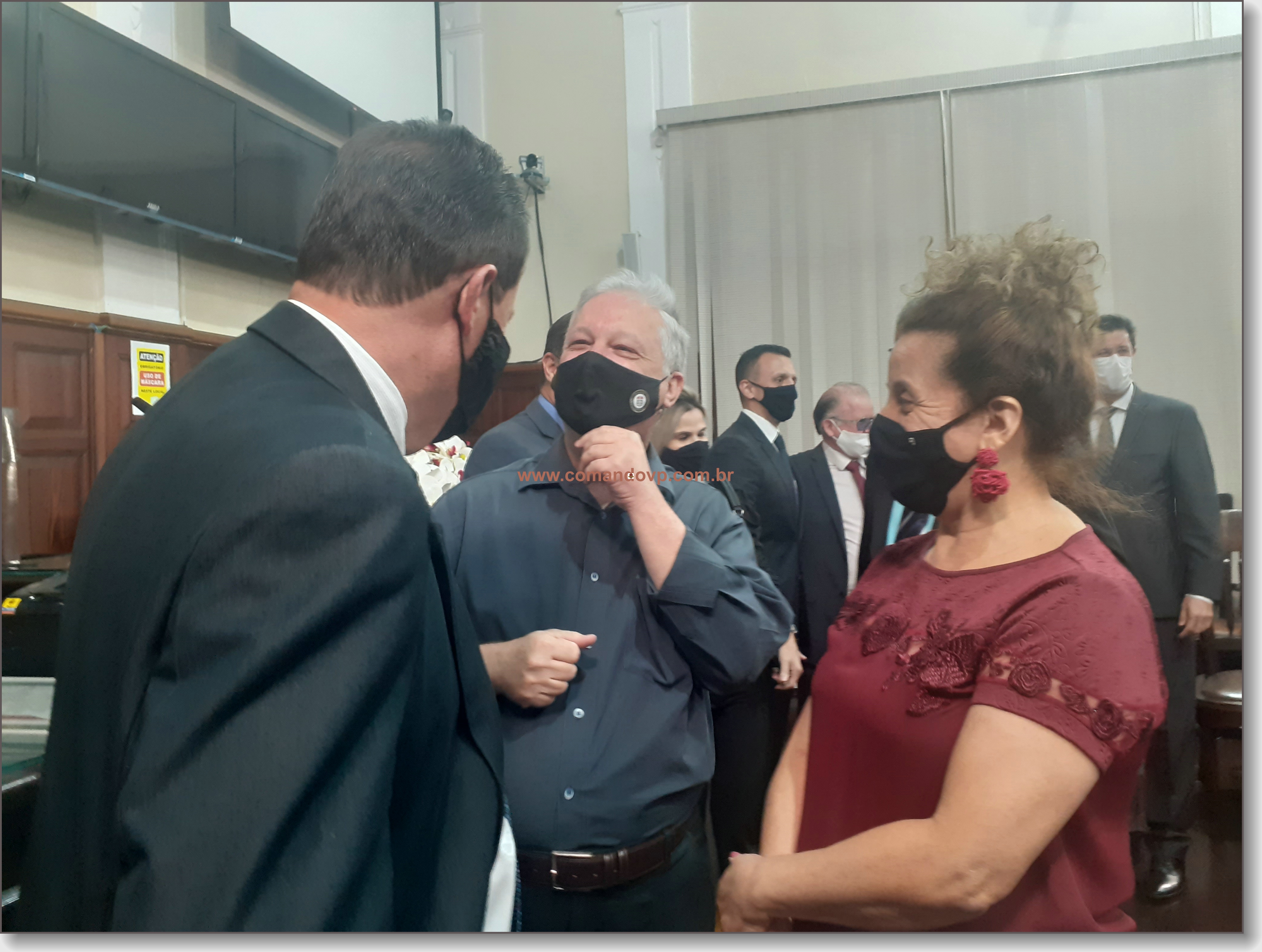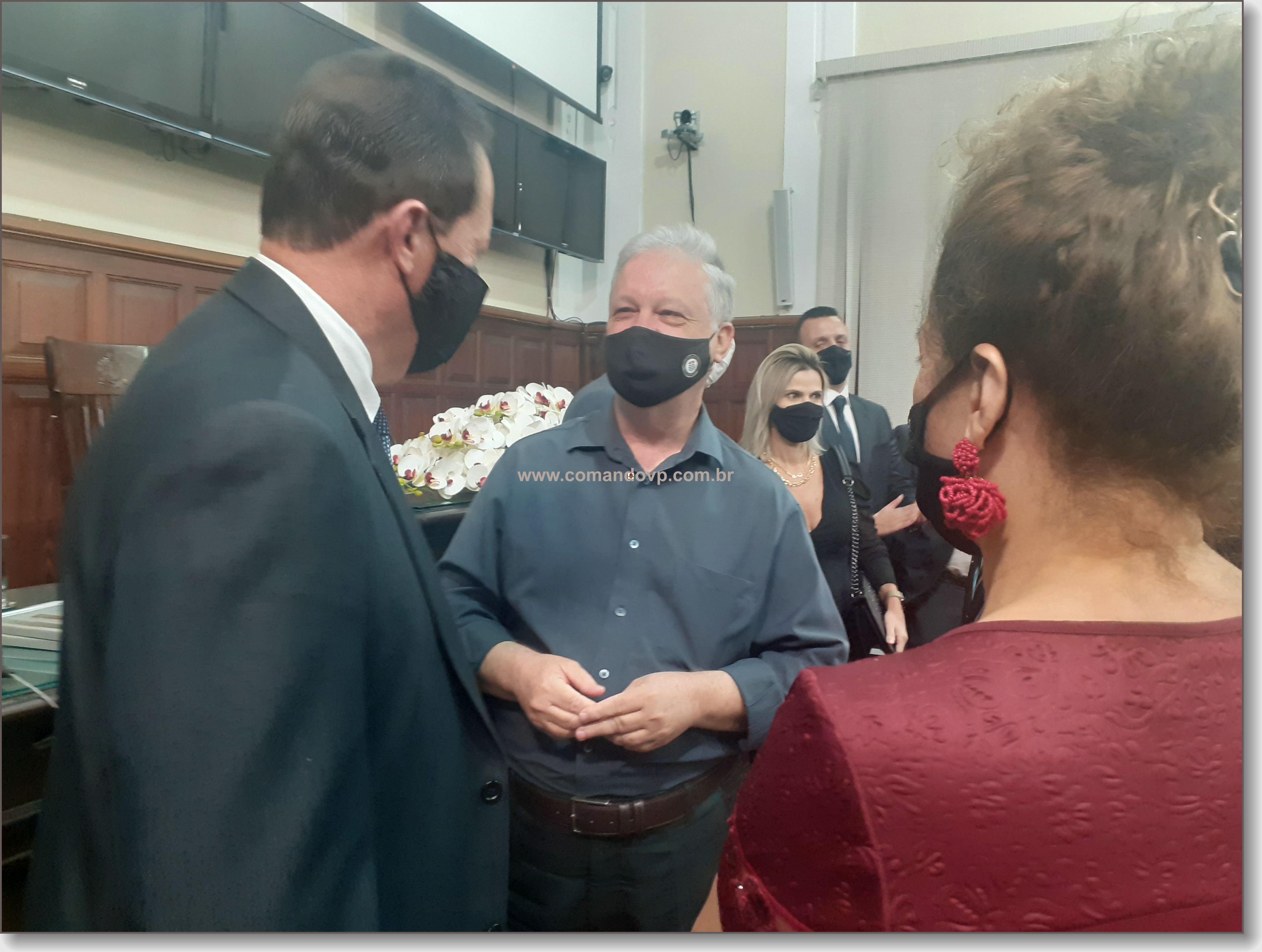 O vereador Lucão e os delegados Geraldo Souza Filho e Rogério Fakhani Vita durante entrega de títulos de cidadania na Câmara