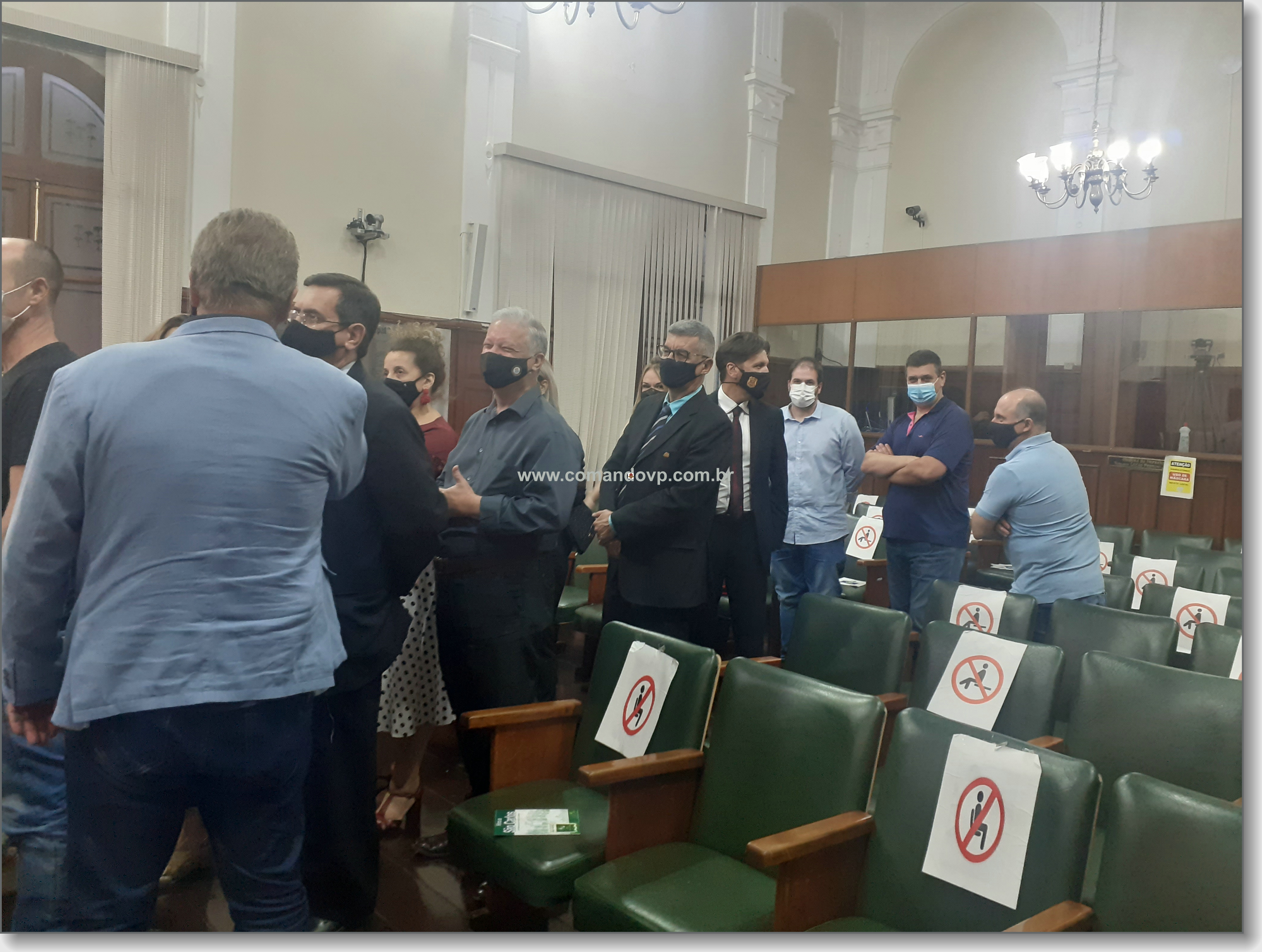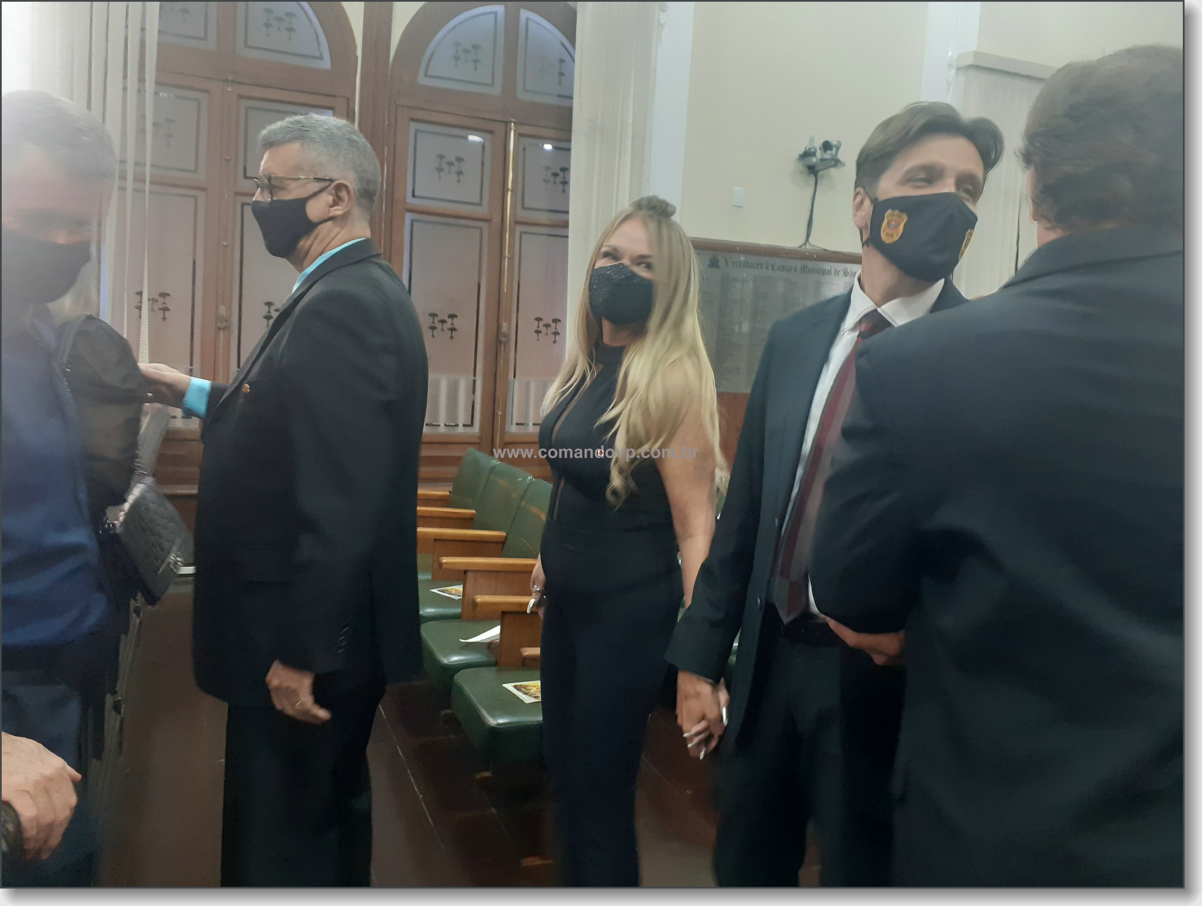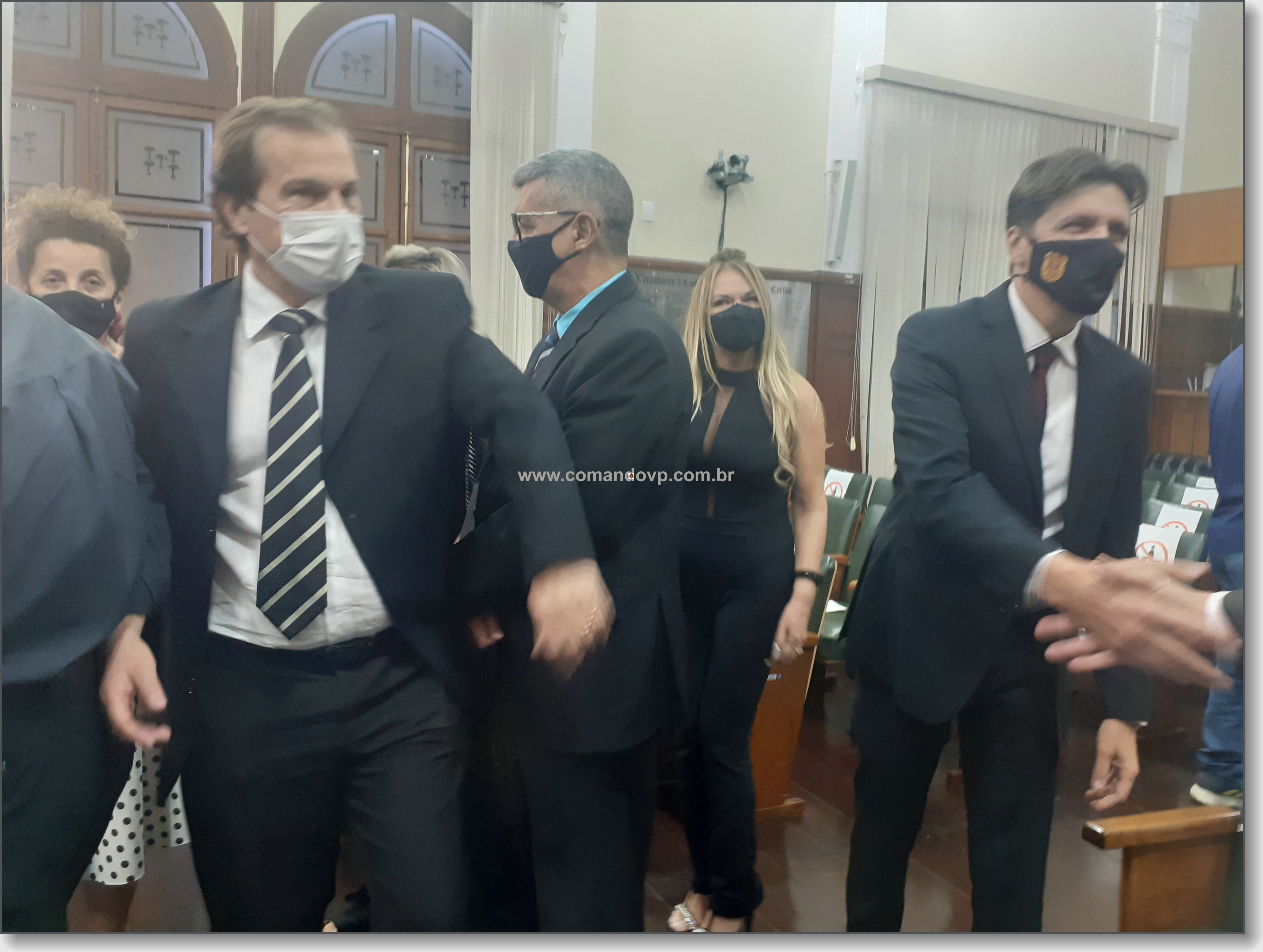 O vereador Lucão e os delegados Geraldo Souza Filho e Rogério Fakhani Vita durante entrega de títulos de cidadania na Câmara
