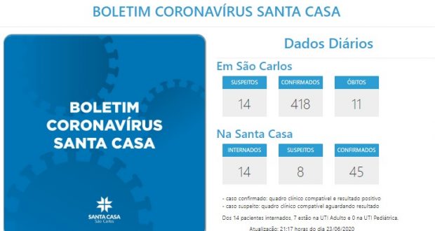A Santa Casa informa nesta *terça-feira (23/06)* que o número de casos confirmados subiu de *43* para *45*. Trata-se de 1 mulher, de 31 anos, de outro município, internada desde 20/06, que recebeu alta hoje. E 1 mulher, 69 anos, de São Carlos, internada desde o dia 21/6 na UTI Adulto.