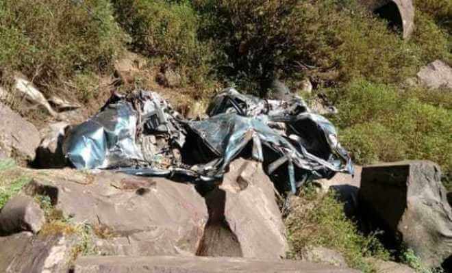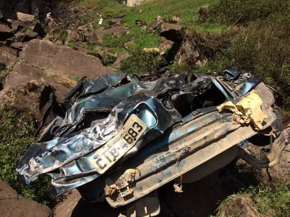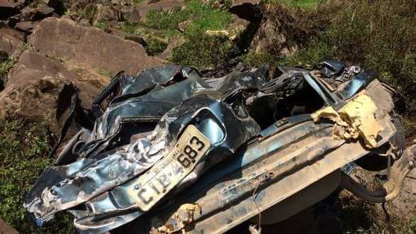 O Ford Escort ficou completamente destruído. Pai e os dois filhos morreram na queda. Peritos e bombeiros fizeram vistoria no veículo.