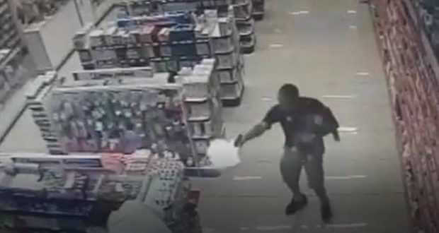 O circuito de segurança de uma farmácia 24 horas registrou o momento em que o policial, que estava à paisana e com o filho bebê no colo, começa a trocar tiros com suspeitos dentro do estabelecimento.