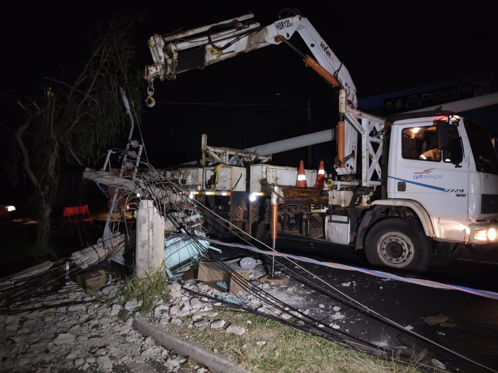 Segundo a CPFL, a expectativa da troca dos postes e retomada do fornecimento de energia deverá ser por volta das 00h00 desta sexta-feira (25).