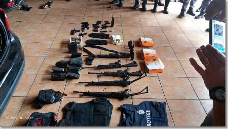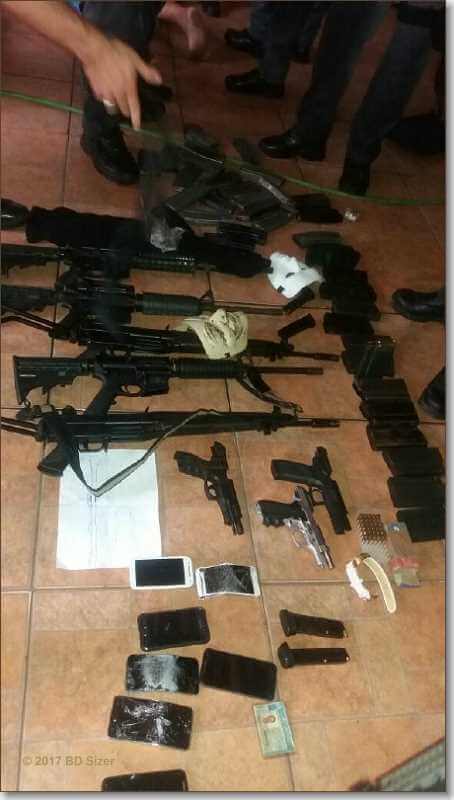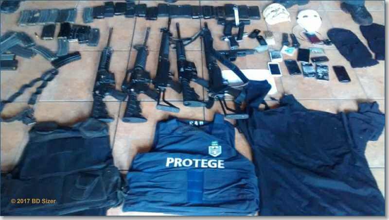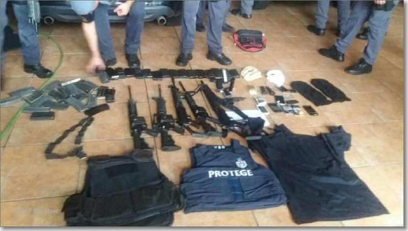 Com o bando os policiais apreenderam cinco fuzis (556 e 762), três pistolas, dois coletes a prova de balas, dezenas de carregadores e munições, além de radiocomunicadores, máscaras, tocas (ninjas) e diversos celulares.
