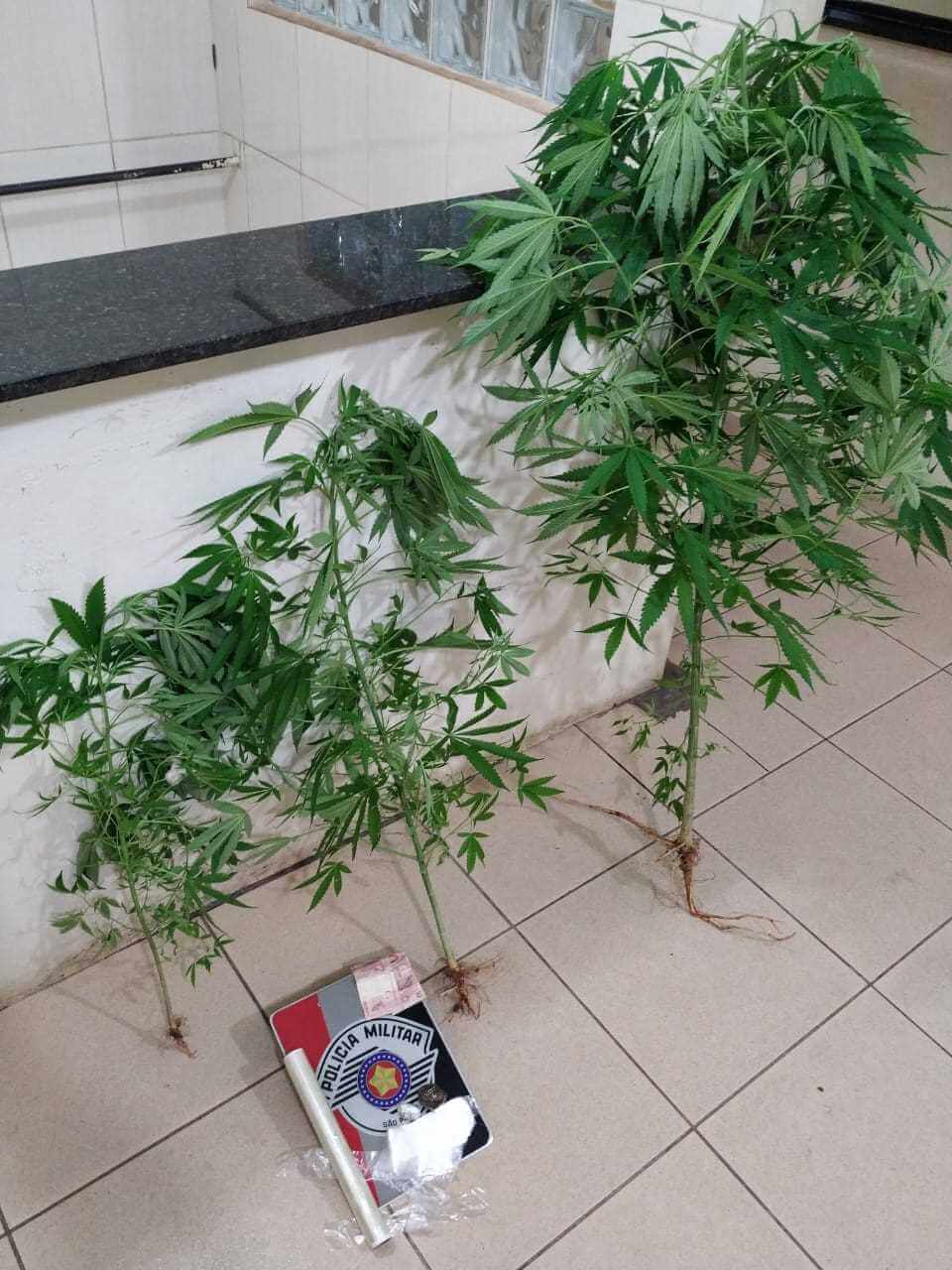 Segundo informações, o sargento Anderson, soldados Lazarine e Michel estavam pela rua Narus Nishirara quando avistaram alguns indivíduos, que ao perceber a viatura empreenderam fuga a pé. Um pulou o muro de uma residência. Foi feito contato com o morador, o qual franqueou a entrada da equipe. Em busca não foi localizado o indivíduo, porém foram localizado 03 três pés de maconha, 02 porções de maconha, R$20,00 e embalagens para acondicionamento de drogas. Um averiguado foi conduzido ao Plantão Policial, qualificado e liberado.