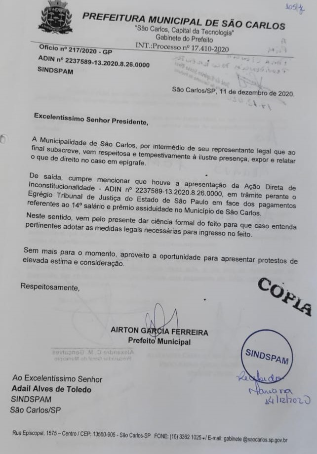 O procurador ressaltou também que o SINDSPAM (Sindicato dos Servidores Públicos e Autárquicos Municipais de São Carlos) foi comunicado dessa ação em dezembro de 2020. “Enviamos um ofício para o Sindicato, por meio do gabinete do prefeito, colocando, inclusive, a possibilidade do SINDSPAM integrar o polo passivo da ação como terceiro interessado. O Departamento Jurídico do Sindicato não se manifestou”.
