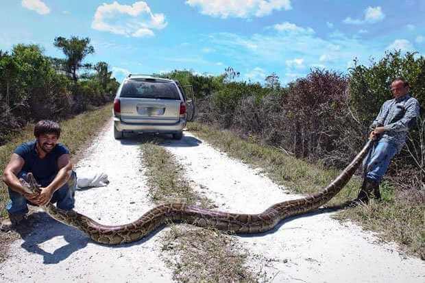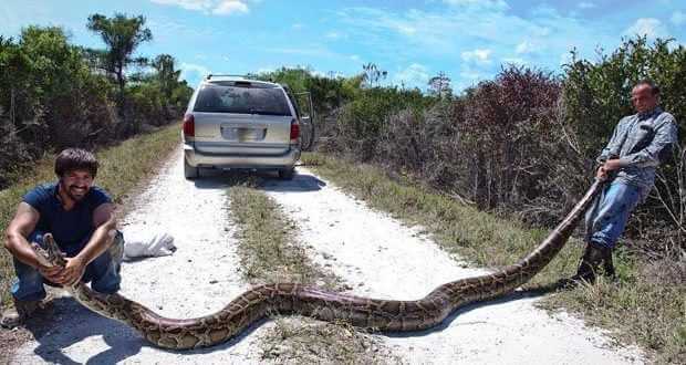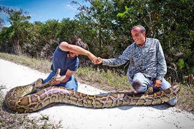 Na passagem pelo parque de Everglades, a dupla capturou uma píton birmanesa de 5 metros de comprimento. A espécie está se reproduzindo muito rapidamente na região e representa ameaça.