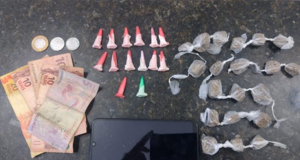 Segundo informações, a cabo Simone e cabo Alexsandro estavam em patrulhamento, quando avistaram dois indivíduos. Eles teriam tentado esconder 14 pinos de cocaína (11g), vinte porção de maconha (43g), R$56,60 e um celular em um veículo Belina, mas foram detidos e encaminhados para a Central de Polícia Judiciária, onde o delegado autuou o maior em flagrante e recolheu ao Centro de Triagem. O menor foi liberado.