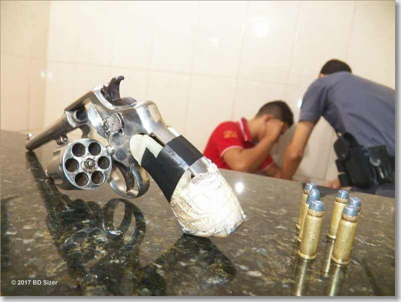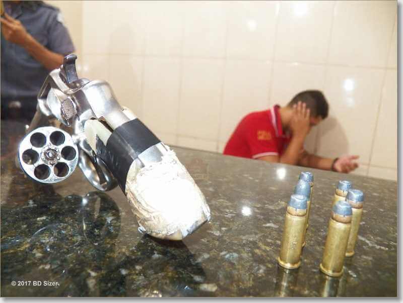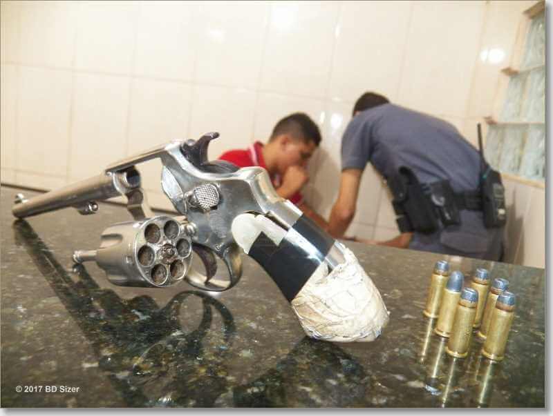 De acordo com informações colhidas por nossa equipe de reportagem, os policiais, Villar, Frisene, Claudinei e com apoio do capitão Nucci, estavam em patrulhamento preventivo quando se depararam com o veículo Fox sendo conduzido por Bruno Caetano da Silva, de 21 anos. Ele foi abordado e no interior do carro foi localizado o revólver calibre 22, com seis munições intactas e numeração suprimida. Bruno foi encaminhado ao Plantão Policia, mas até o fechamento desta matéria sua situação não havia sido definida.