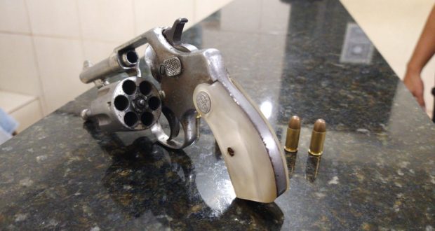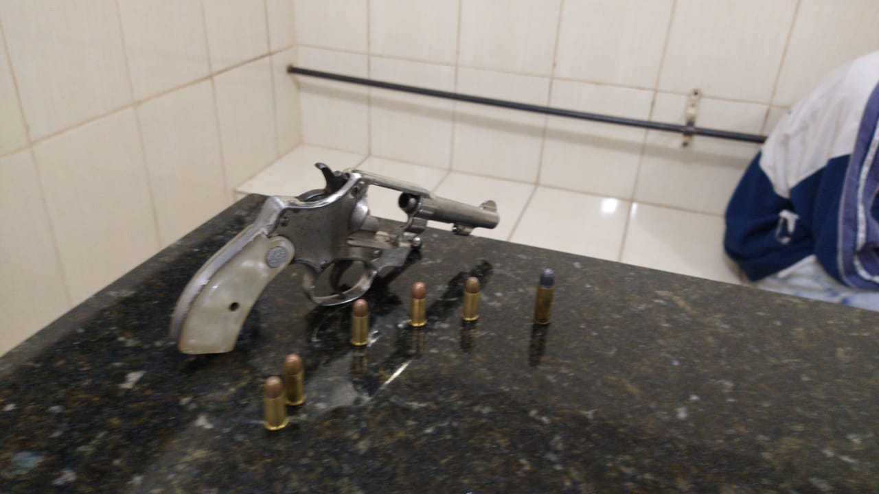 O suspeito foi abordado e realizado a busca pessoal. Na sua cintura do averiguado foi encontrado um revólver calibre 32 com 6 munições intactas. A arma estava com a numeração suprimida.