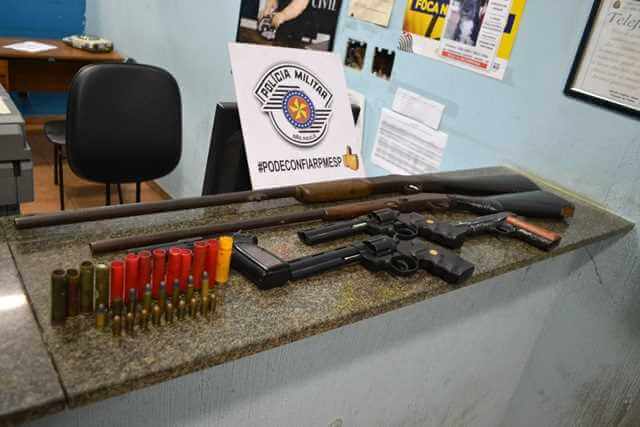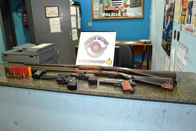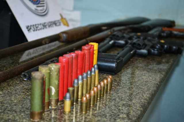 No local apreenderam algumas armas e nas residências de familiares, as demais, com munições de calibres 38, 380 e cartuchos de espingardas. Quatro pessoas foram qualificadas em boletim de ocorrência, mas apenas um jovem de 20 anos foi detido, sendo que os demais não estavam na propriedade rural. O cabo Campos disse que as armas parecem com as mesmas apontadas pelas vítimas de roubos em postos de combustíveis.
