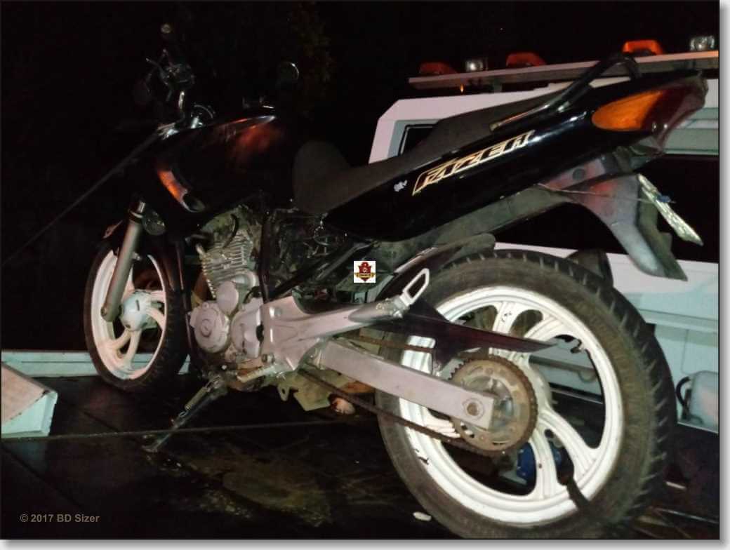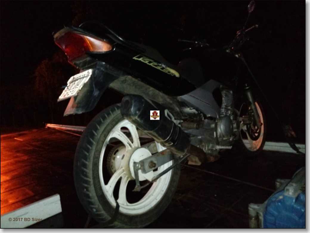 A moto da cor preta, placa de Guarulhos-SP, estava com o número de motor lixado. A moto foi apresentada no Plantão Policial e recolhida ao Pátio pelo delegado Dr. Gilberto de Aquino.