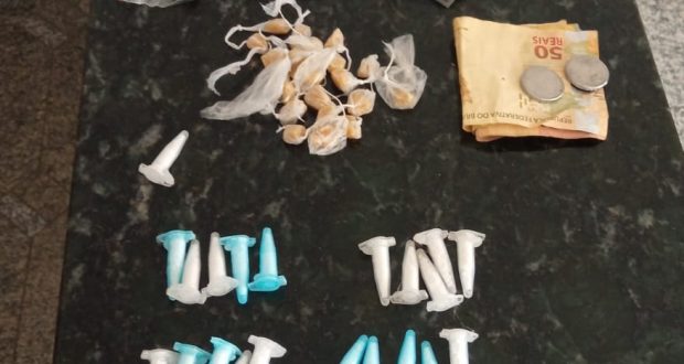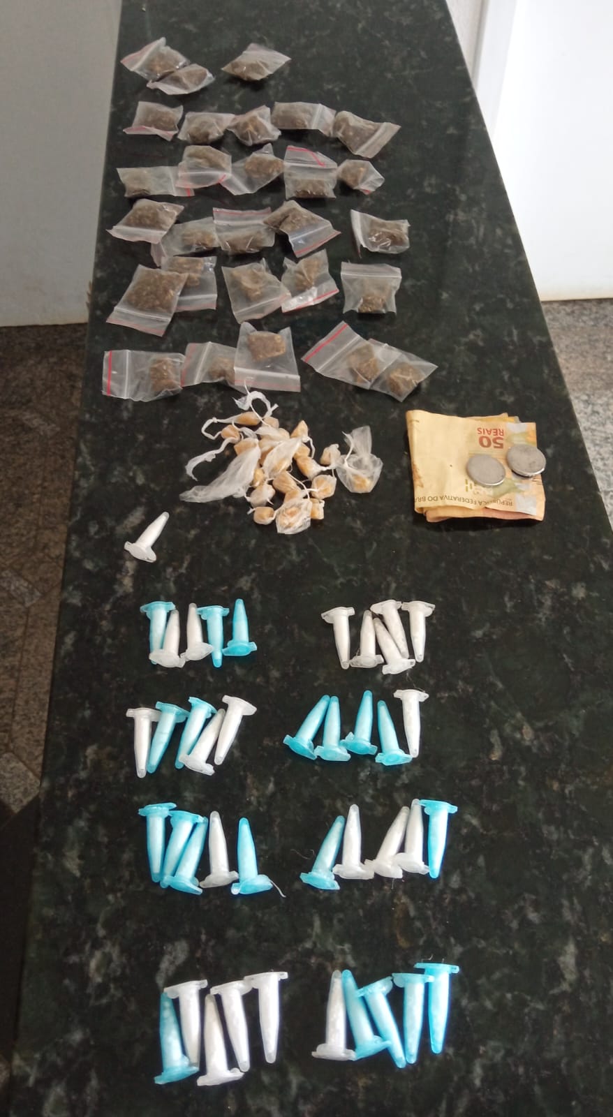 Na sacola foram  localizados 28 invólucros de maconha, 41 pinos  de cocaína, 22 pedras de crack e R$100 em notas mmiúdas. O traficante não foi detido. A ocorrência foi encaminhada para a Delegacia de Polícia Civil,  onde as drogas e o dinheiro foram apreendidos.