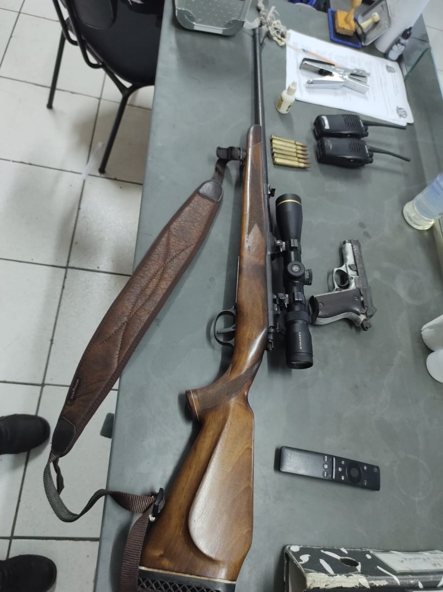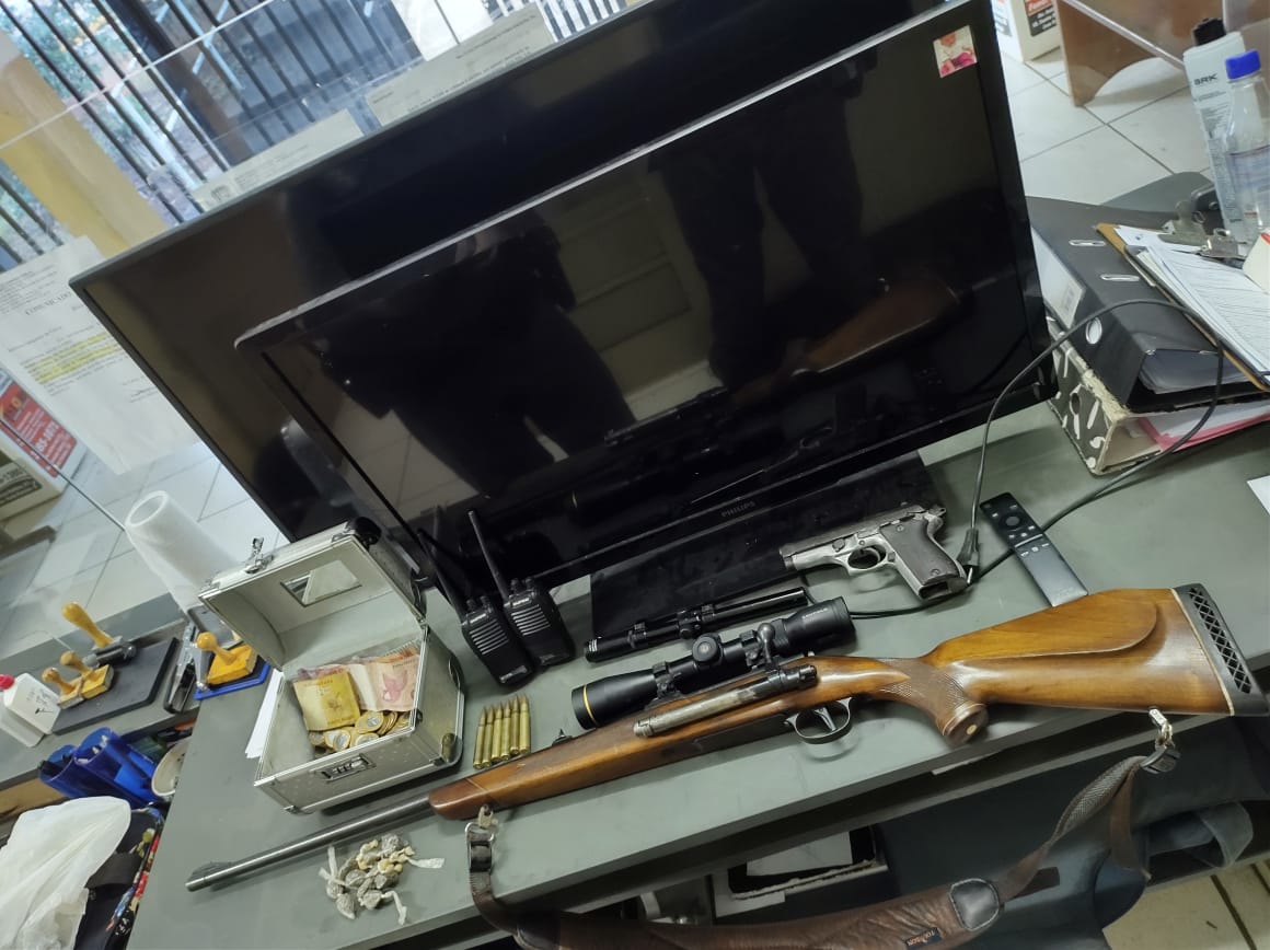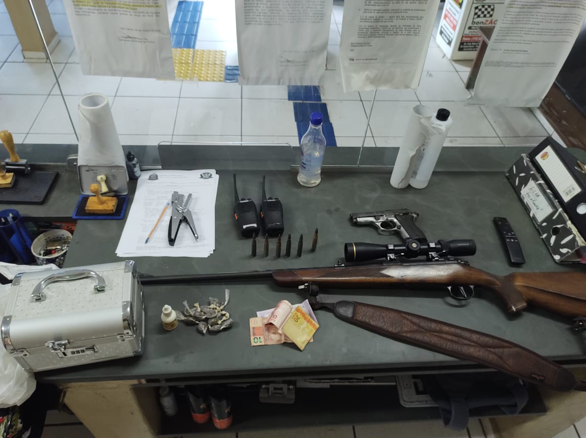 Segundo informações, uma equipe da PM estava em patrulhamento pelo bairro Vila Maria, quando se deparou com dois indivíduos, que empreenderam fuga e adentraram em uma mata. Os policiais saíram no encalço, porém um dos suspeitos adentrou a uma casa. Os policiais tiveram a autorização para averiguar o imóvel e localizaram 13 pedras de crack, 10 porções de maconha, 1 fuzil marca CZ mod.600 ZKK n°A9055 cal.30/06; 1 pistola marca Taurus mod.PT-57 n°E15286 cal.7,65; 1 luneta Leopold VXR; 1 luneta Bushnell Sportview; 6 munições cal.30/06 intactas; 2 televisores;