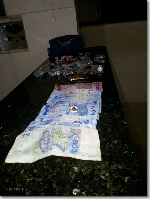 Segundo informações, os soldados,  Tercio e Alex  receberam denúncia que neste local na caixa de energia elétrica havia drogas. 23 trouxinhas de  maconha,  13 pedras de  crack,  3 pinos cocaína R$ 44,00  e também R$ 8,00 no bolso do menor foram localizados.