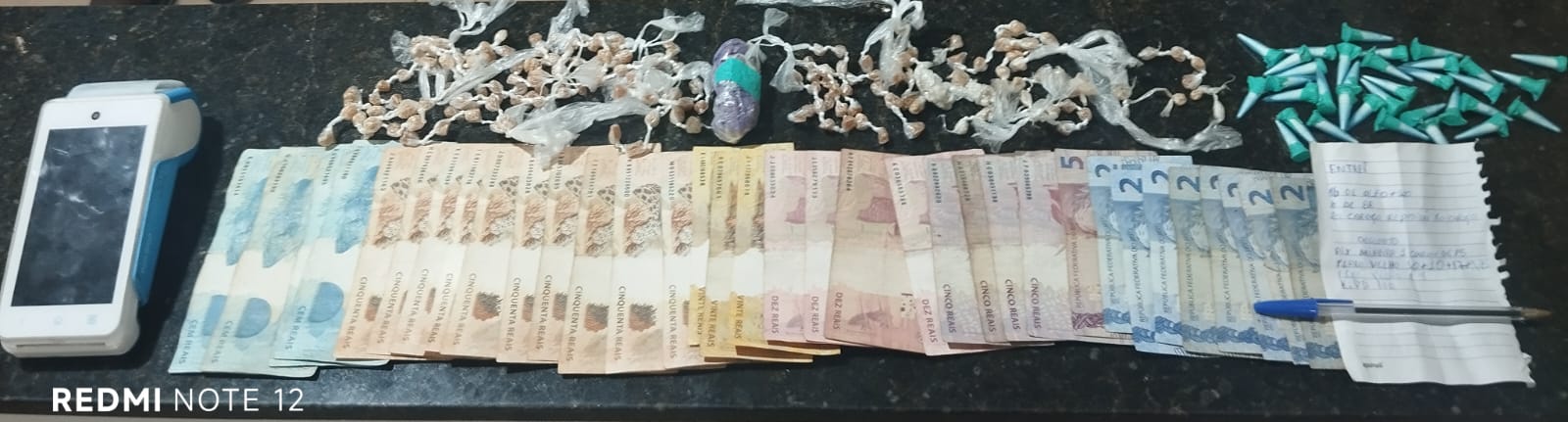 De acordo com informações, o Centro de Operações da Polícia Militar (COPOM) recebeu uma denúncia, que um indivíduo estaria traficando no referido local. Os policiais foram averiguar a procedência da denúncia e abordaram dois sujeitos. Ambos estavam defronte a um ferro velho. Com um foi encontrada uma pedra de crack e com o outro, certa quantia em dinheiro, 05 pinos de cocaína e 13 pedra da mesma droga. Eles disseram que eram funcionários do ferro velho, mas a história não se confirmou. O sujeito que estava com o dinheiro e também com as drogas, acabou confessando que estava na traficância. Nas proximidades os policiais encontraram mais drogas. No total foram apreendidos 217 pedras de crack, 33 pinos de cocaína, R$1.041,00, uma máquina de cartão e um papel com anotações do tráfico. Através de pesquisa, foi possível confirmar que S. F. S, estava constando como evadido do sistema prisional. T. C. M. S e S. F. S, foram encaminhados para a Central de Polícia Judiciária, onde permaneceram à disposição da justiça.