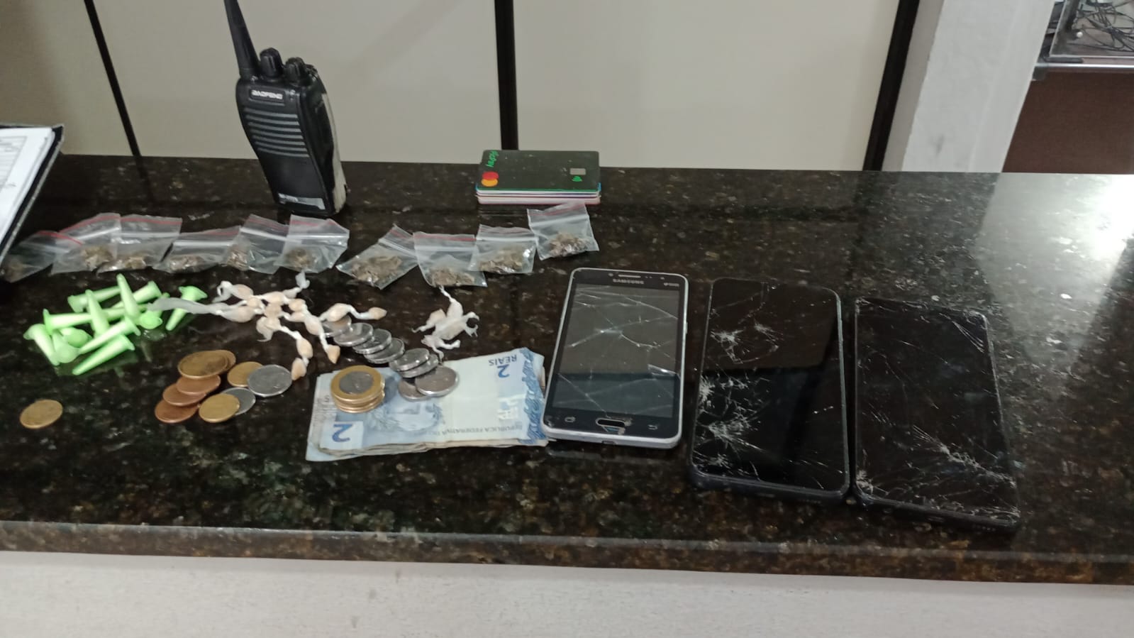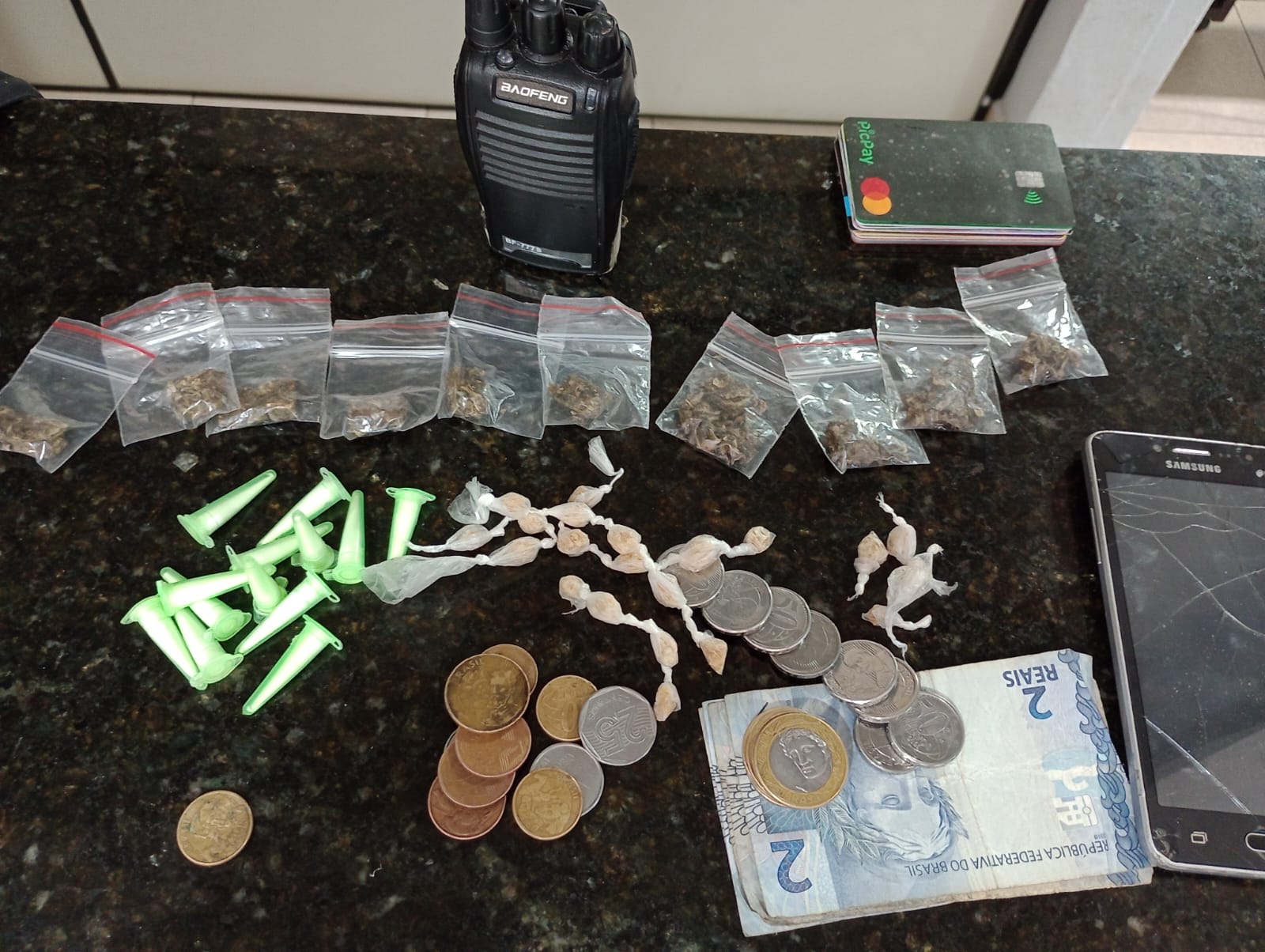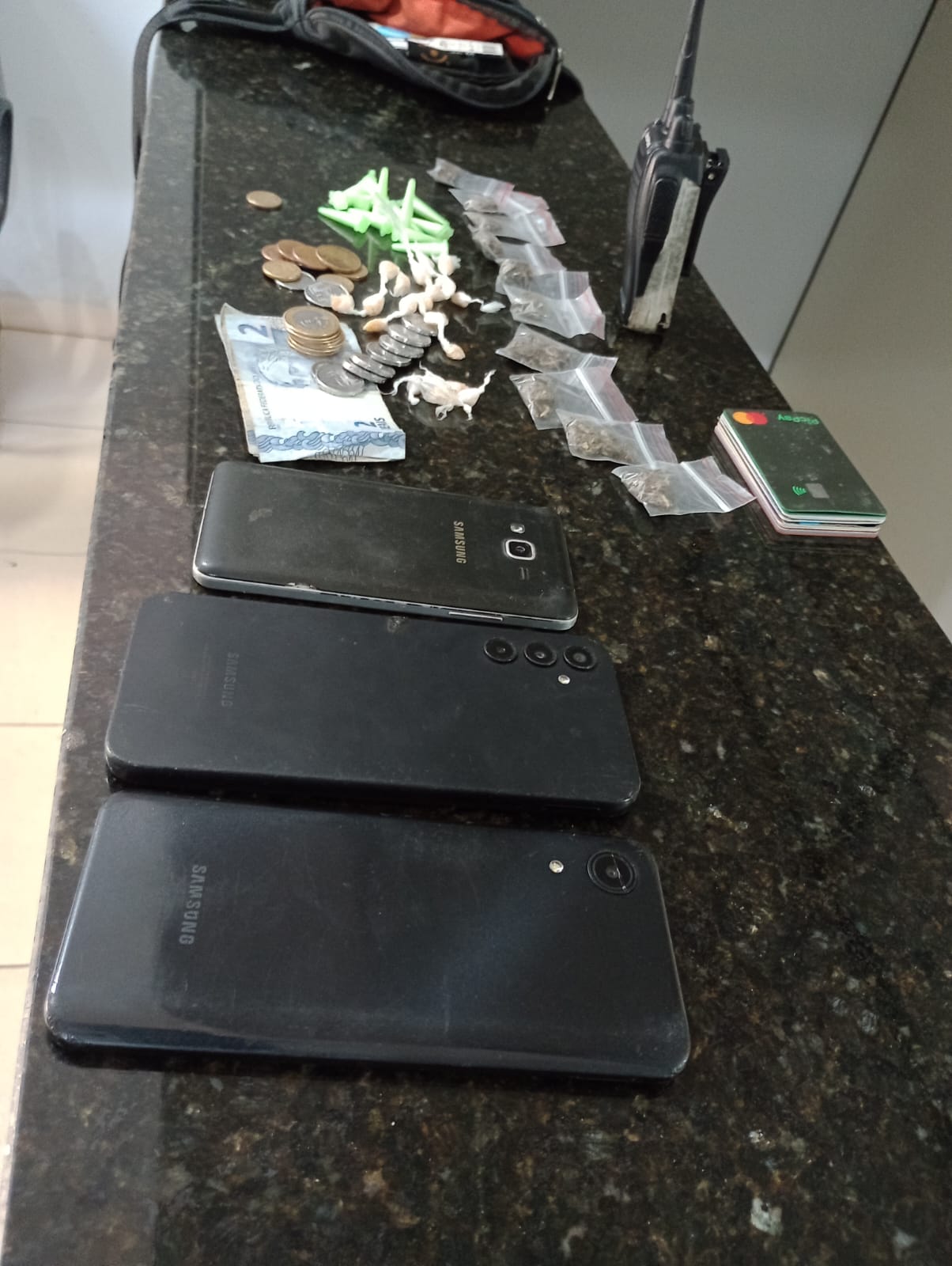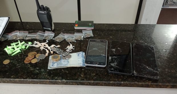 De acordo com informações, o cabo Sobral e o soldado Pereira estavam em patrulhamento preventivo, quando se depararam com D.N.O, de 27 anos, o qual estaria vendendo drogas para um motociclista. O comprador conseguiu fugir. Os policiais abordaram D.N.O, e com ele foram localizados 10 porções de maconha, 13 pinos de cocaína, 21 pedras de crack, um rádio HT, vinte e dois reais, 11 cartões de crédito e 3 celulares. A ocorrência foi apresentada na Central de Polícia Judiciária, onde está sendo apresentada a autoridade policial.