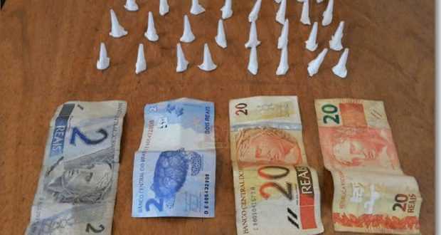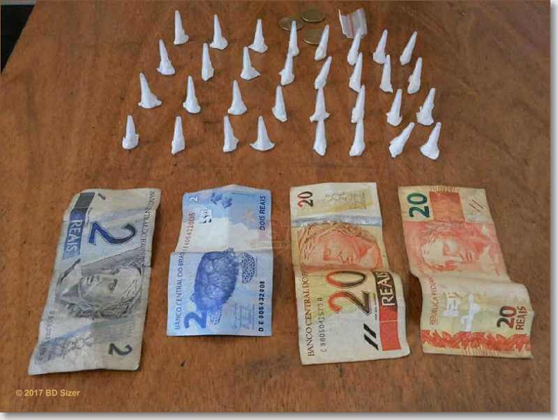 Segundo consta, os soldados Pascoalino e Romero estavam em operação quando visualizaram um grupo de pessoas, sendo que o averiguado saiu andando, mas foi abordado. Sendo localizado valor de R$ 44,oo, reais 32 pinos com cocaína e uma porção pequena de cocaína.