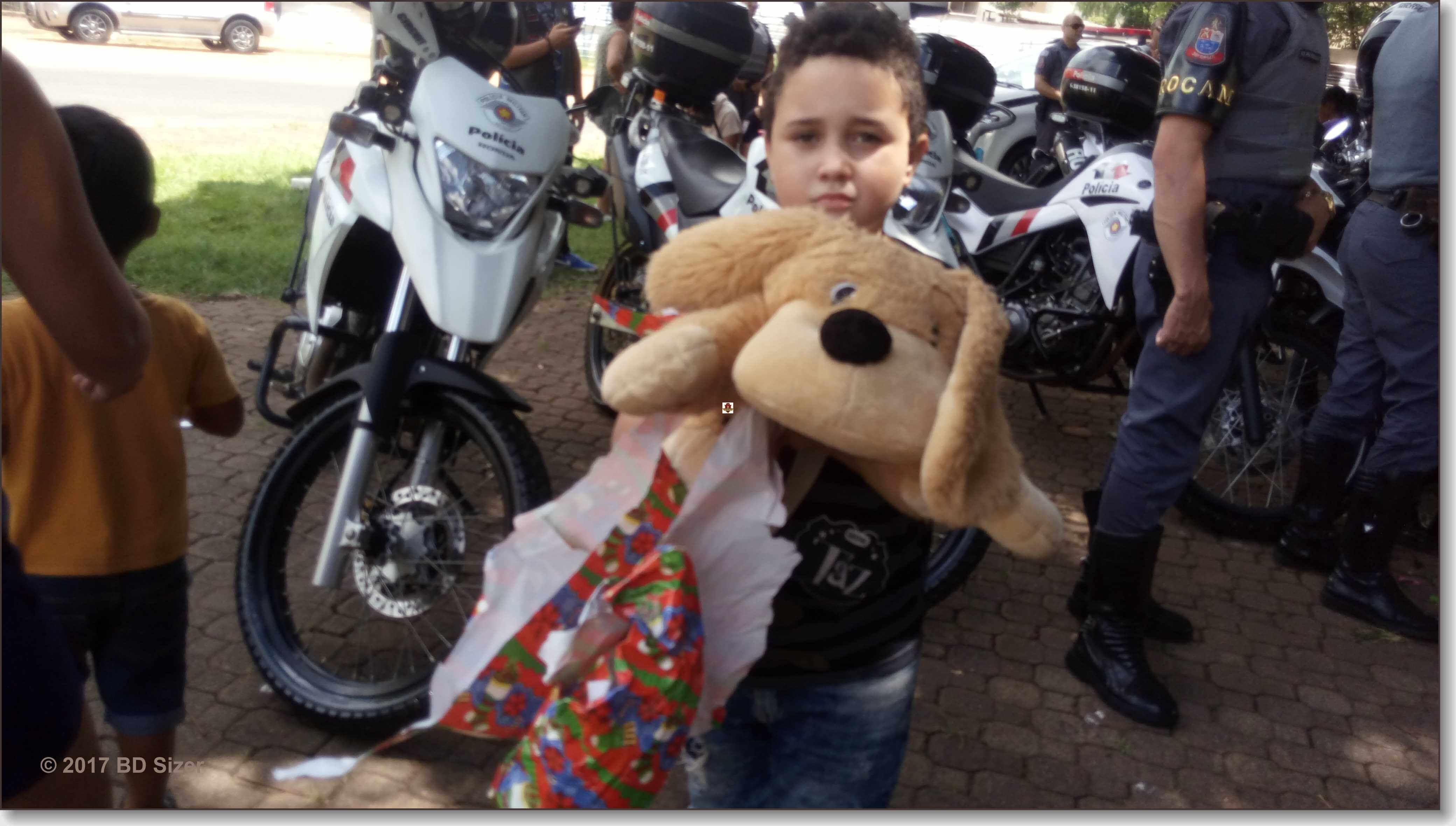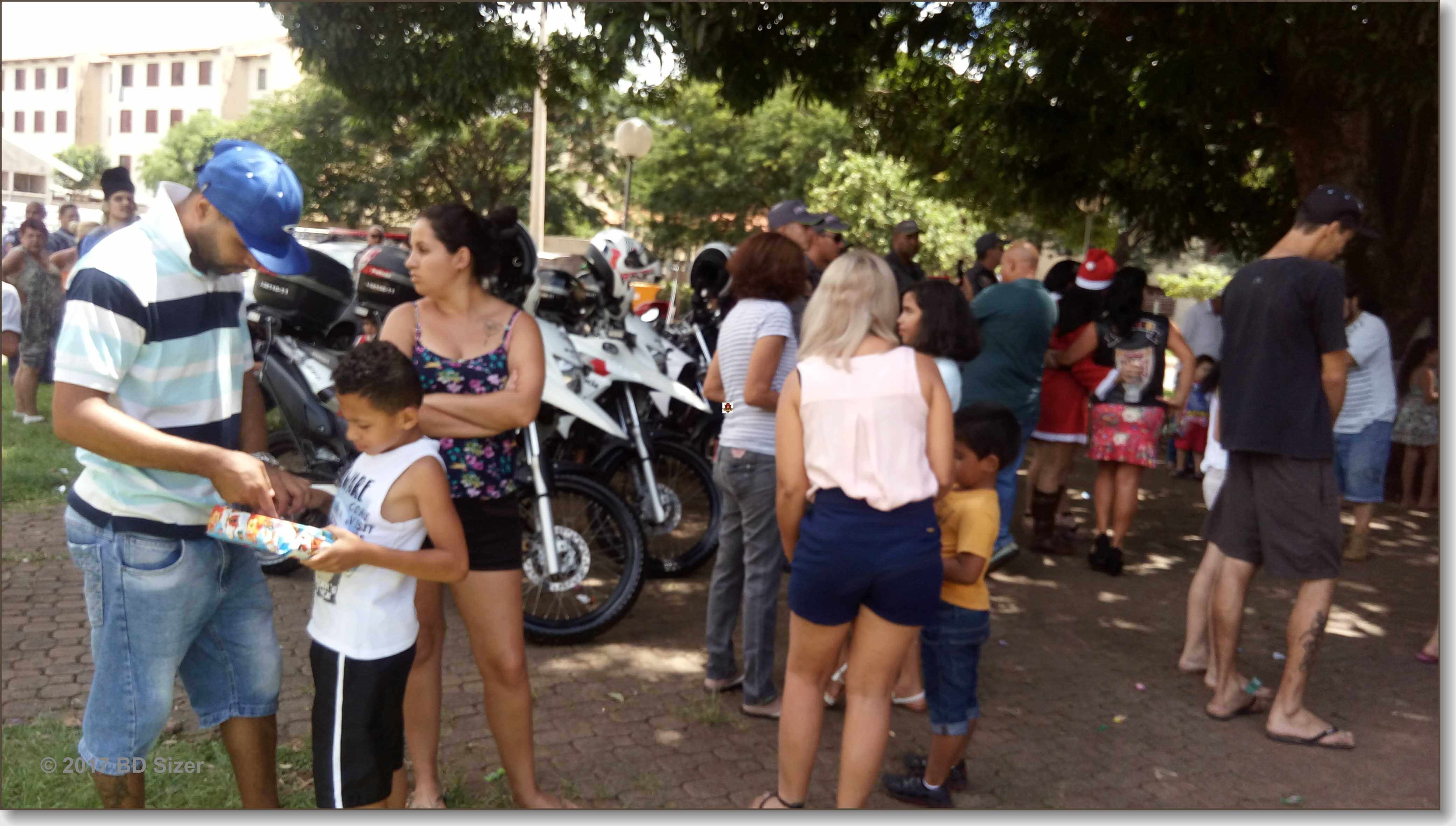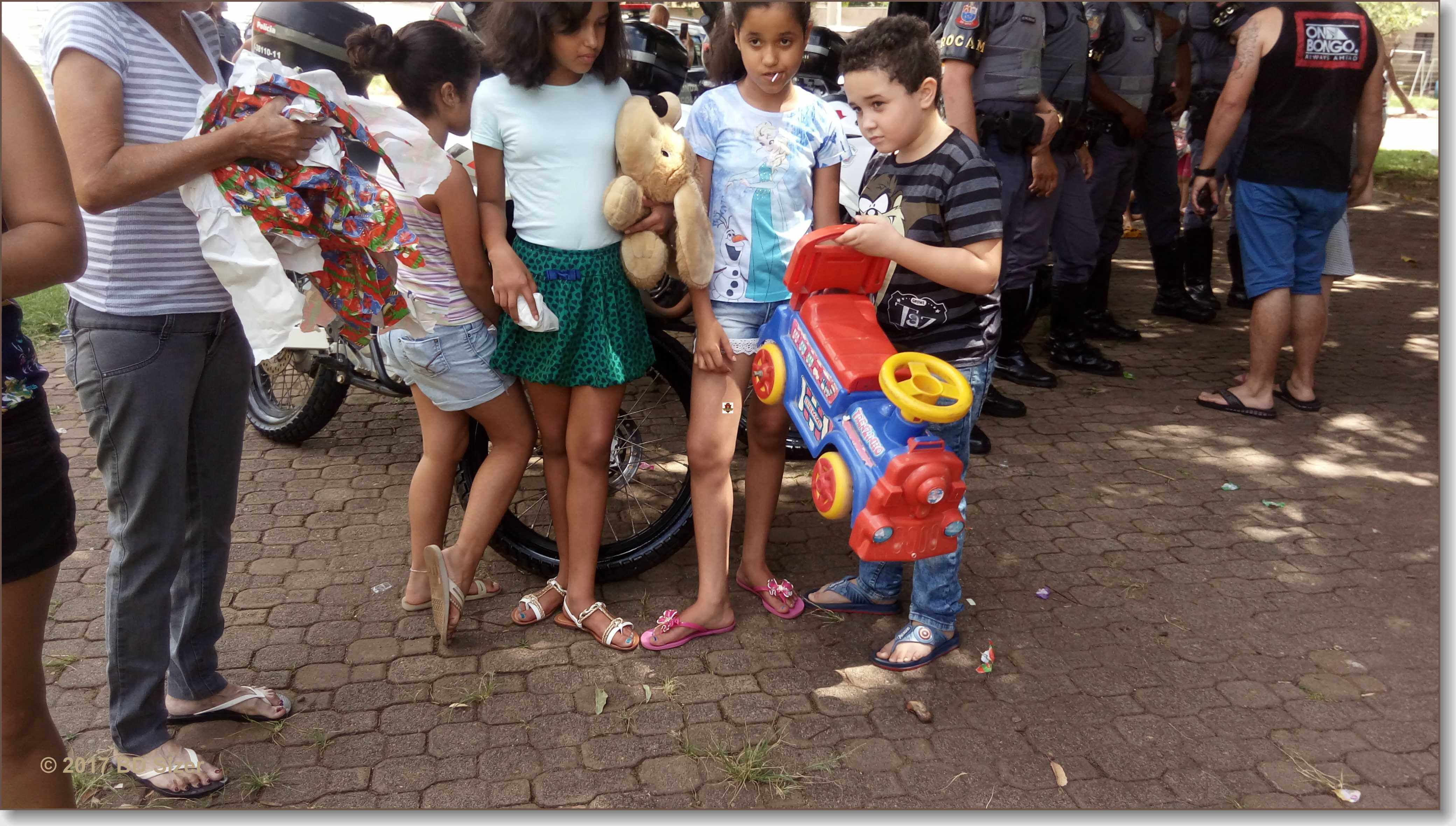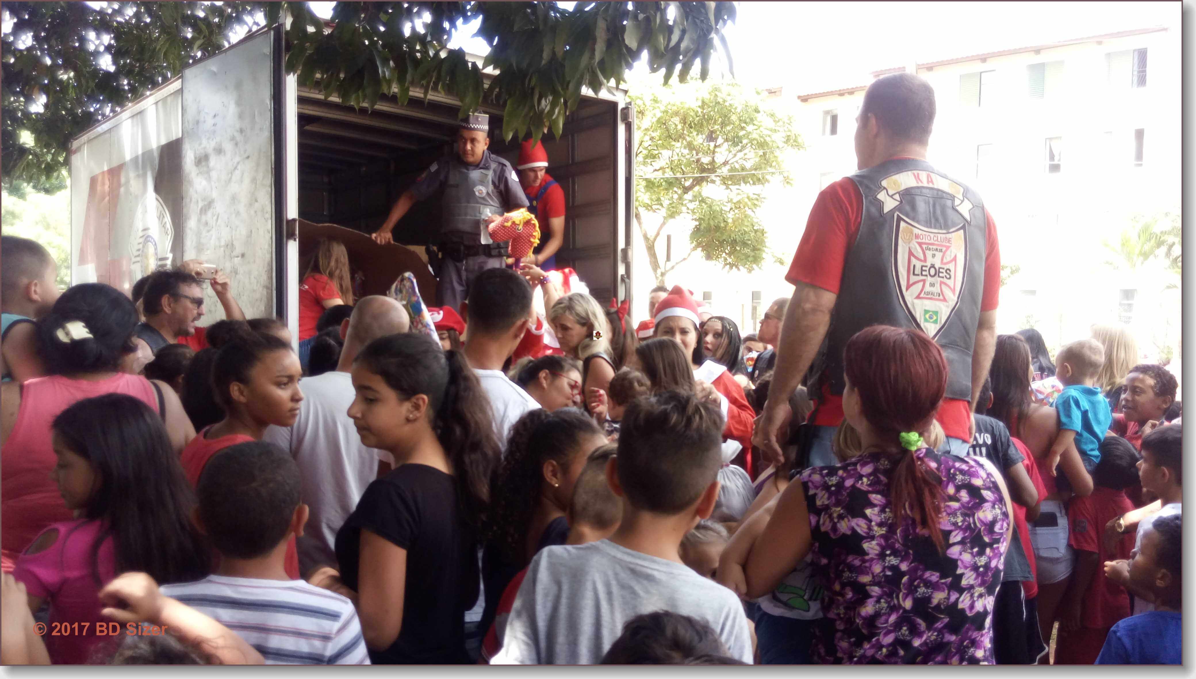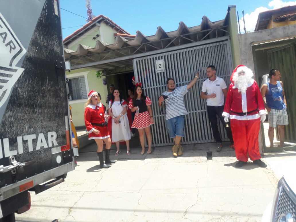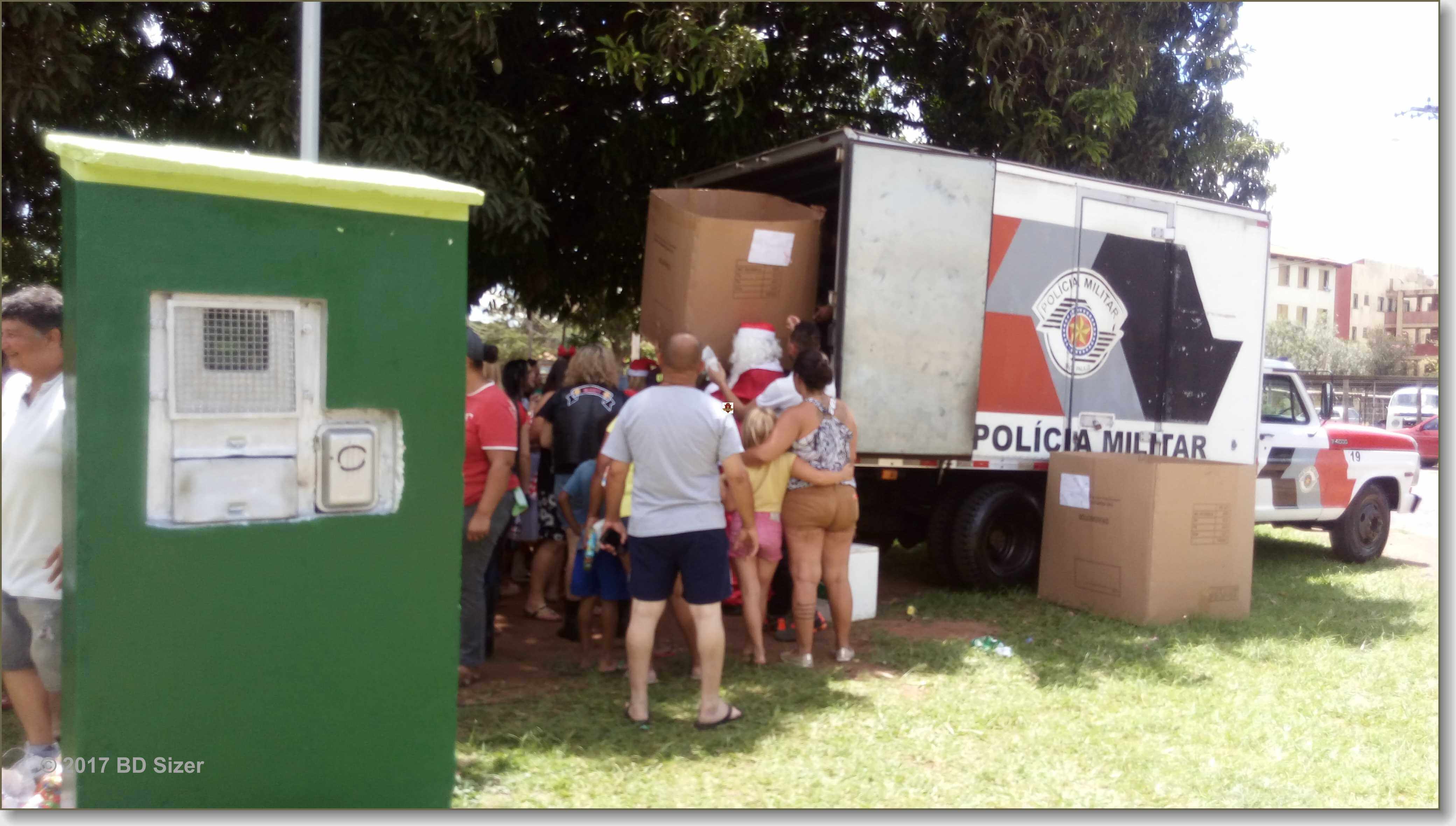 A Polícia Militar de São Carlos-SP, juntamente com uma organização não governamental, fizeram a alegria de dezenas de crianças nesta tarde de domingo, 17-12-2017, no CDHU, bairro de Vila Isabel.