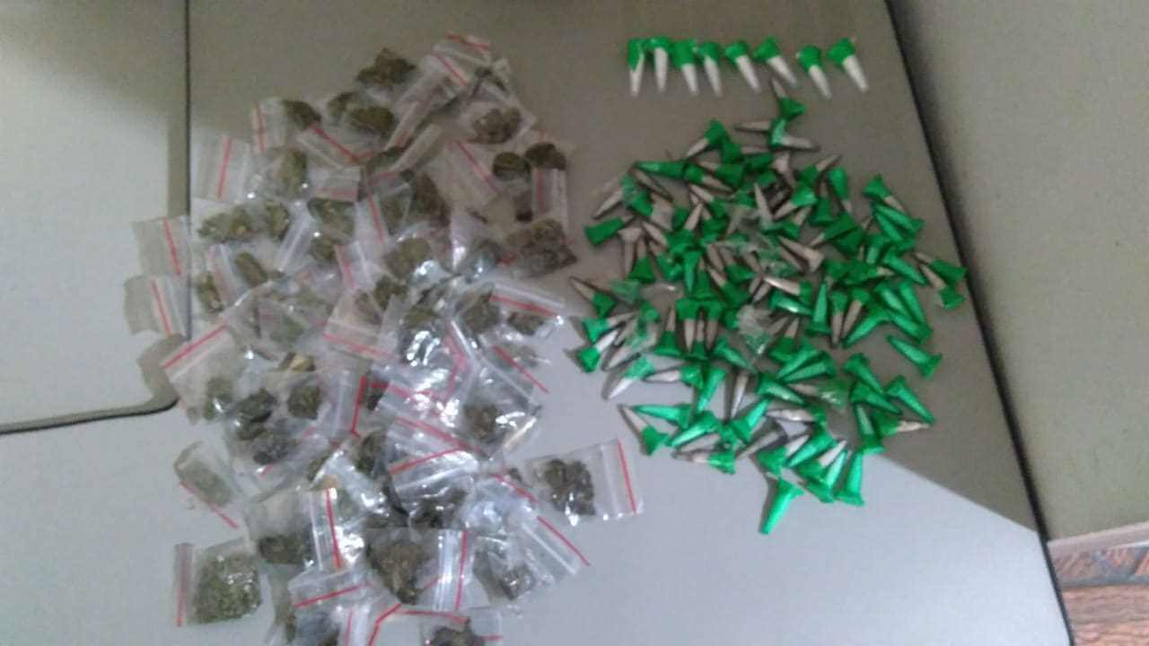 No apartamento feito contato com a sua amásia, a qual autorizou a entrada das equipes, e em vistoria conjunta das duas modalidades, foi localizado 02 sacolas plásticas, contendo 112 micro tubos de cocaína e outra 81 trouxinhas de maconha.
