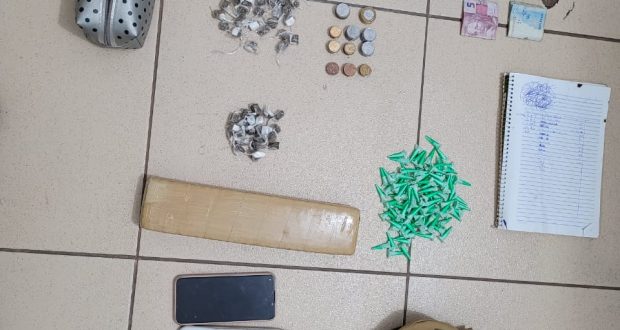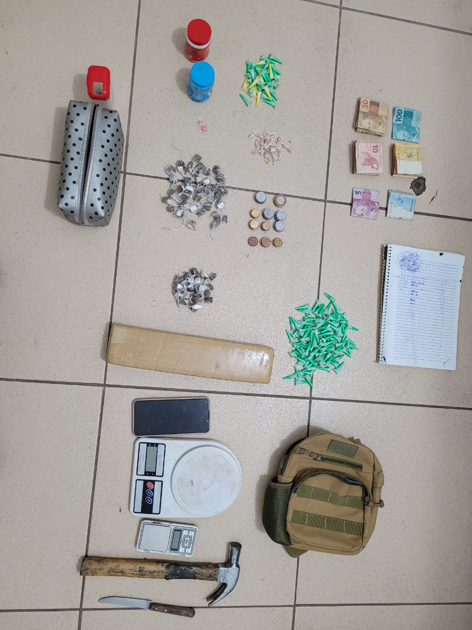 Segundo boletim de ocorrência, a PM estava realizando uma operação denominada “Saturação”, para diminuir o crime de tráfico de drogas e roubo, em dado momento, policiais avistaram R.H.F.B, de 24 anos, na via pública carregando uma mochila da cor marrom. Este saiu em desabalada carreira, adentou a uma casa e fechou o portão. O indivíduo jogou a mochila no telhado de uma casa vizinha e tentou fugir, mas se deparou com uma outra equipe policial que estava na Rua Gaudêncio Zaninette. O indivíduo foi detido e no interior da mochila foram localizados 95 pinos de cocaína, um aparelho celular, 24 porções de maconha, R$ 1.318, 00. Na casa onde o indivíduo havia adentrado, a PM encontrou em uma mesa, 37 porções de maconha, 42 pedras de crack, 34 pinos de cocaína e R$ 18,60. No quintal no meio das folhas secas de uma árvore, foram encontradas duas balanças de precisão, um tijolo de maconha e um martelo. O meliante foi conduzido