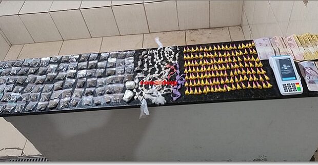De acordo com informações, um sargento e dois soldados estavam em patrulhamento preventivo, quando avistaram um sujeito em atitude suspeita. Ele foi abordado e em seu poder foram localizados 2 pinos de cocaína, 1 involucro de maconha e 2 pedras de crack. Ao ser questionado, o abordado teria confessando a pratica do crime de tráfico de drogas. O averiguado teria mostrado onde estava o restante da droga e a máquina de cartão. Embaixo da máquina de cartões tinha uma sacola contendo R$ 225, 129 pinos de cocaína, 150 pedras, 100 invólucros de maconha. O suspeito teria tentado fugir e gritado com intuito de ser ajudado por populares. No meio da confusão os dois soldados e o detido ficaram feridos. Ainda de acordo com a PM, o suspeito teria dito que era soro positivo e que estava com fortes dores no corpo. Diante da situação, os PMs e o detido foram encaminhados para a Santa Casa, onde passaram por exames. O médico também fez exame para verificar se o detido era soro positivo, mas sem êxito. A ocorrência foi apresentada na Central de Polícia Judiciária, onde as drogas foram apreendidas e o detido liberado.
