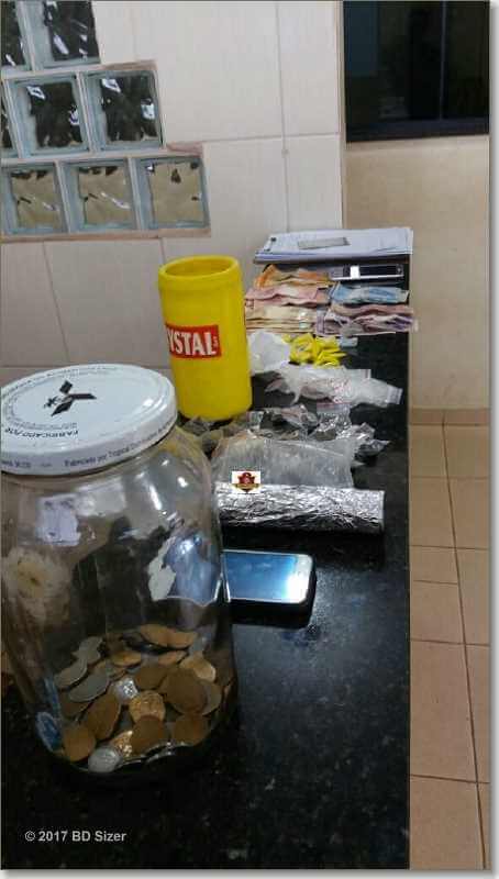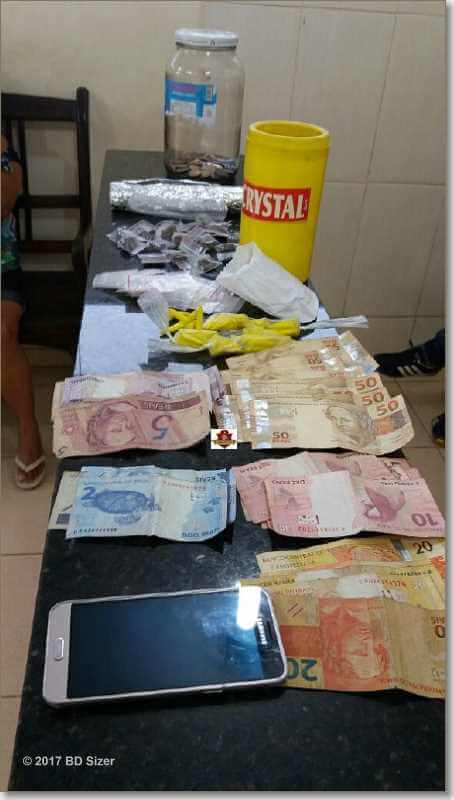 Segundo informações, a  equipe Delegada, composta pelo capitão Nucci e  sargento Gini foi  fiscalizar um estabelecimento comercial e lá foram encontrados  47 pinos de cocaína, 21 porções de maconha, R$ 880,80 e 34 sacos para embalar drogas.