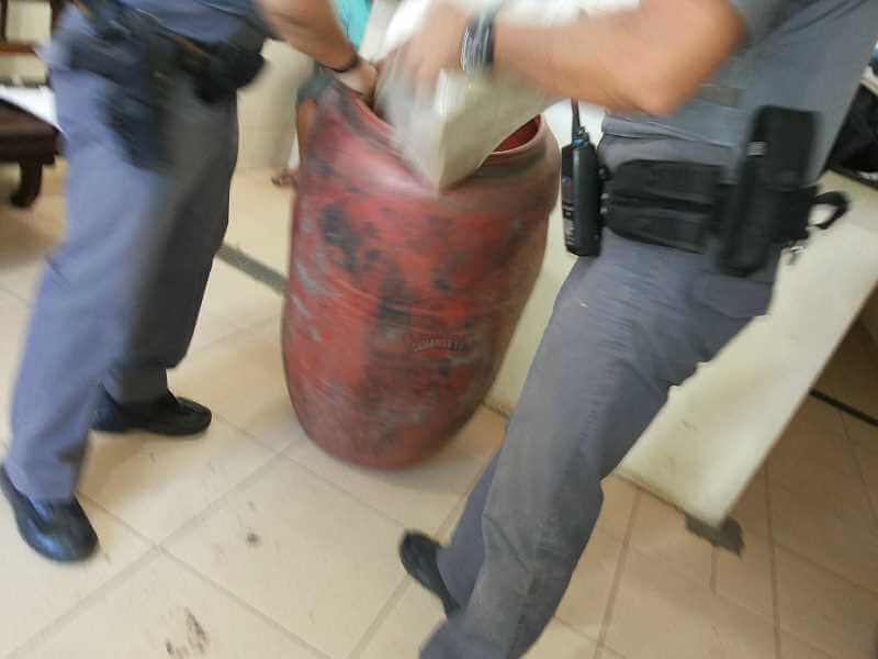 Segundo informações, as drogas estavam enterradas em tambores. Um homem foi detido para averiguação. Todo o material foi encaminhado ao Plantão Policial, onde está sendo apresentado neste momento. Os policiais Cabo Leandro e soldado Michel acionaram a Polícia Científica para colher provas e chegar aos traficantes.