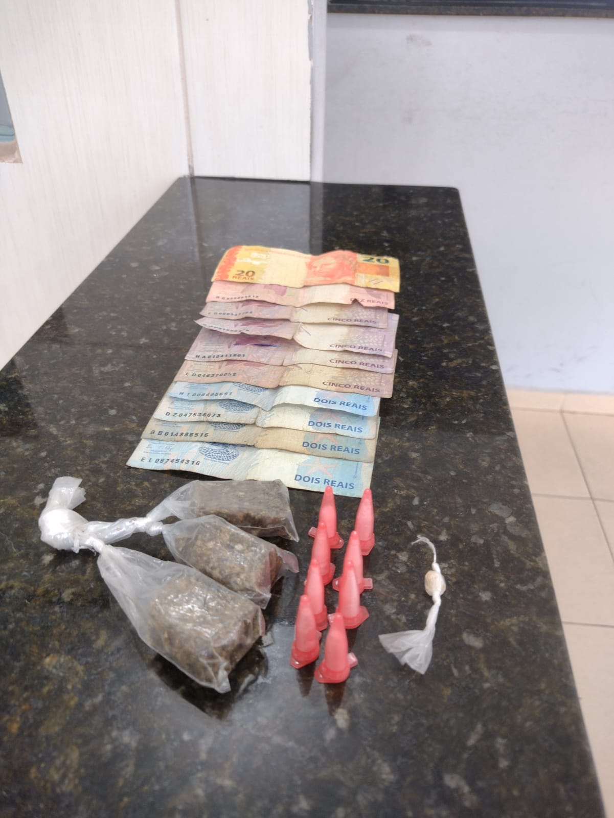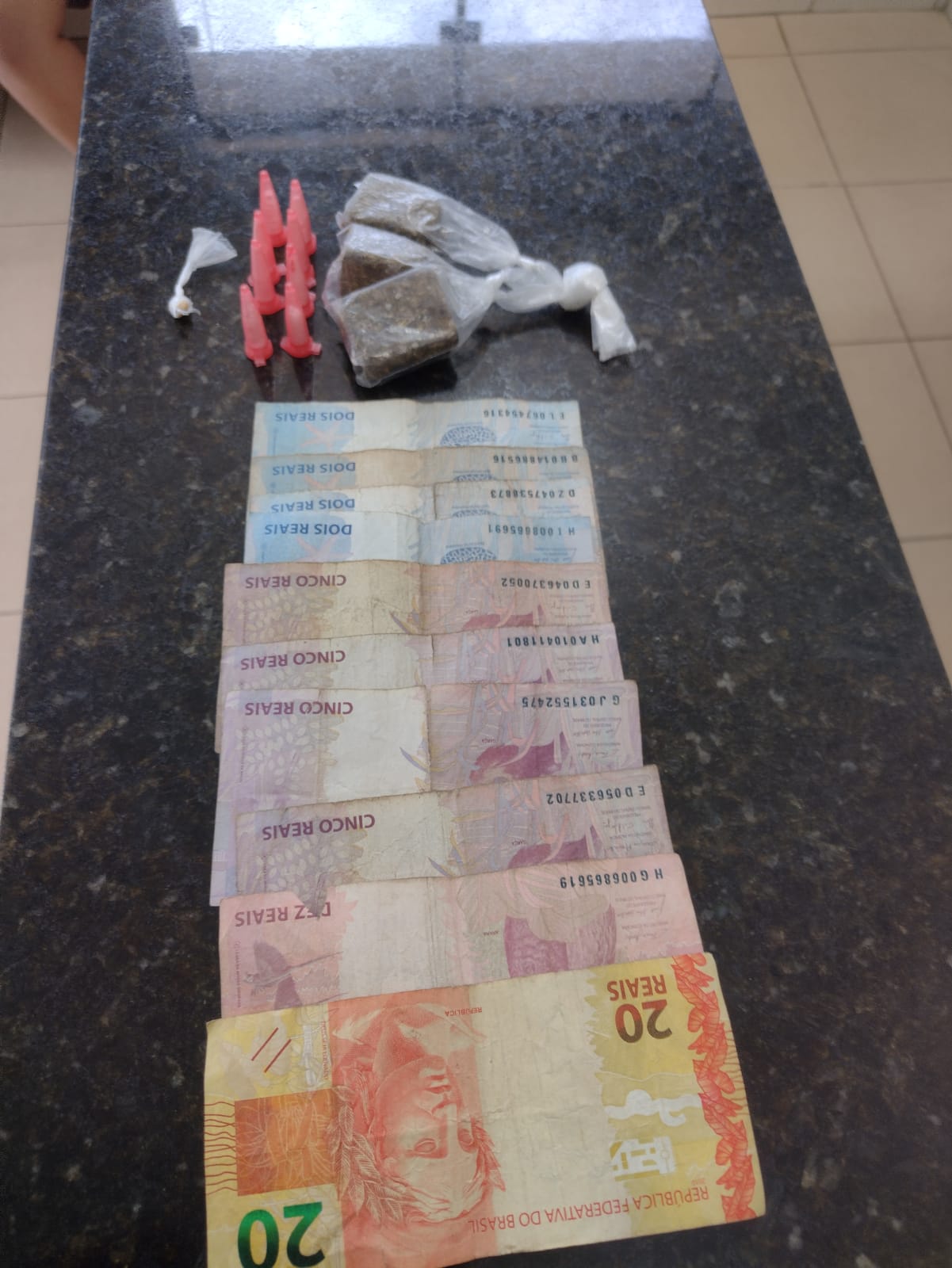 Segundo informações, policiais militares foram acionados para averiguar uma denúncia de tráfico de drogas. O denunciante passou as características dos traficantes e onde eles estariam escondendo as drogas. V.H.S, de 24 anos, foi abordado e em seu poder nada de ilícito foi encontrado. Em poder de uma mulher que estava no local, os policiais encontraram dinheiro. Nas proximidades onde o casal estava, os policiais encontraram drogas. Questionado, o averiguado assumiu que seria o dono das drogas e do dinheiro.