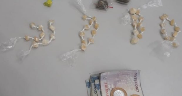 Segundo informações, os policiais se depararam com o indivíduo. Este foi abordado em seu poder localizados 22 pinos de cocaína, 59 pedras de crack, 03 porções de maconha e a quantia de R$ 23,15 .