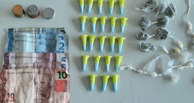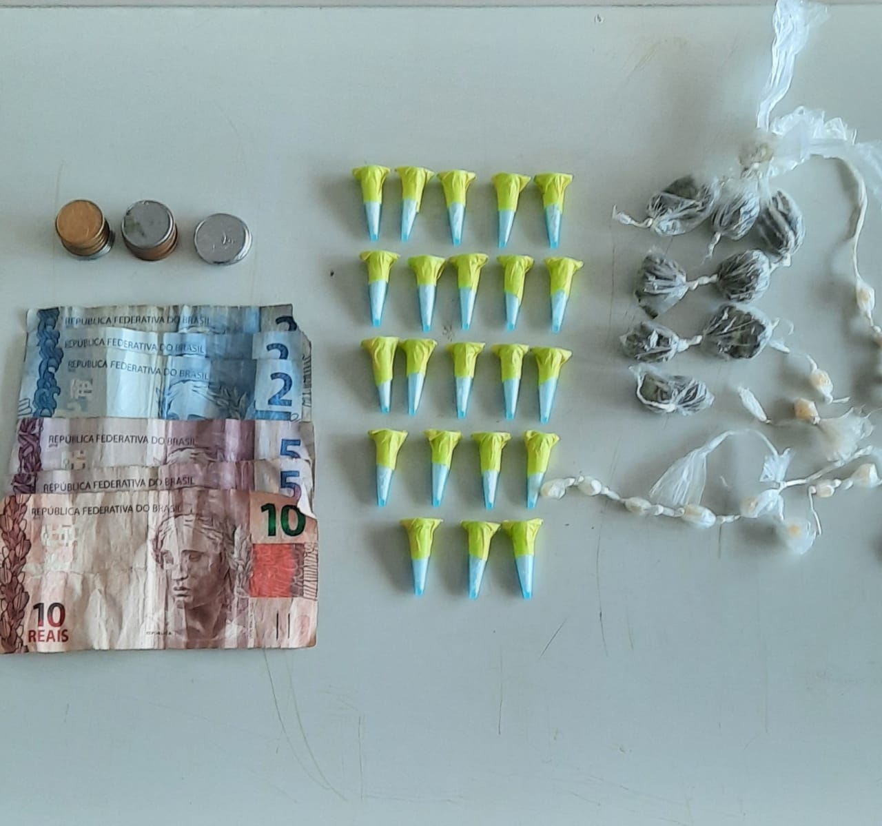 Ao chegar ao local, foi abordado um indivíduo com as características informadas via Copom. Com o suspeito V.L, foi localizada uma sacola branca que continha 22 pinos de cocaina; 15 pedras de crack; 08 porções de maconha; R$ 26,00 reais em espécie e R$ 02,25 em moedas.