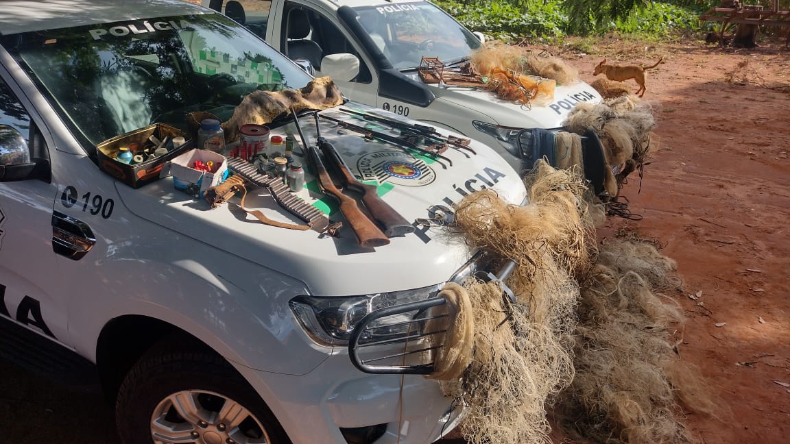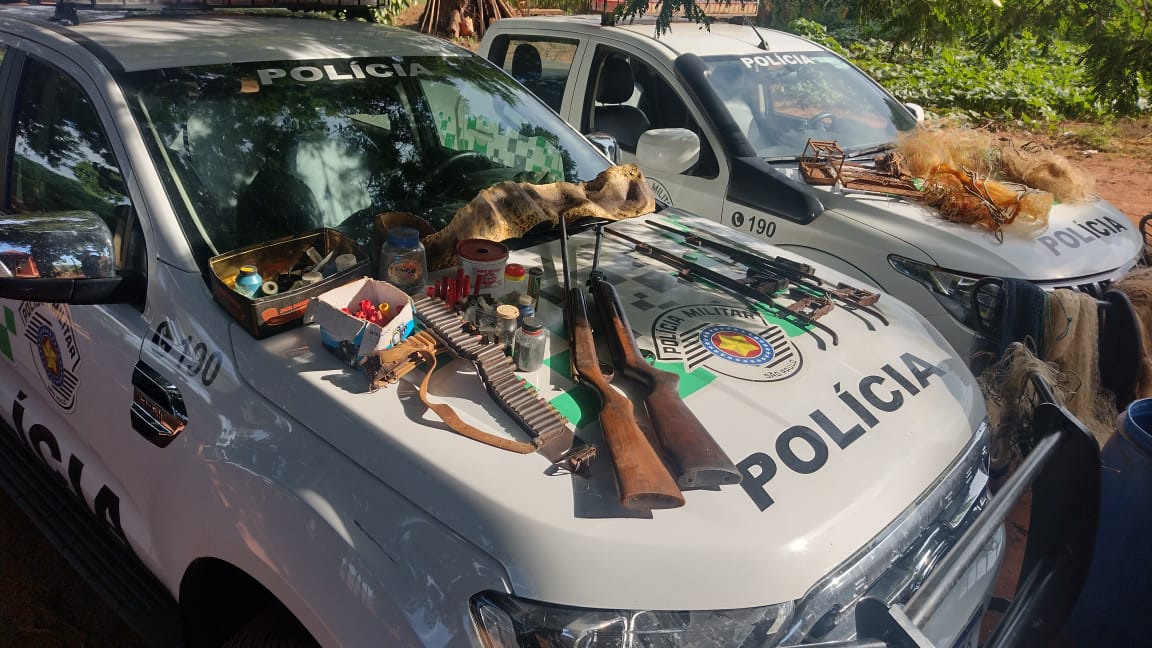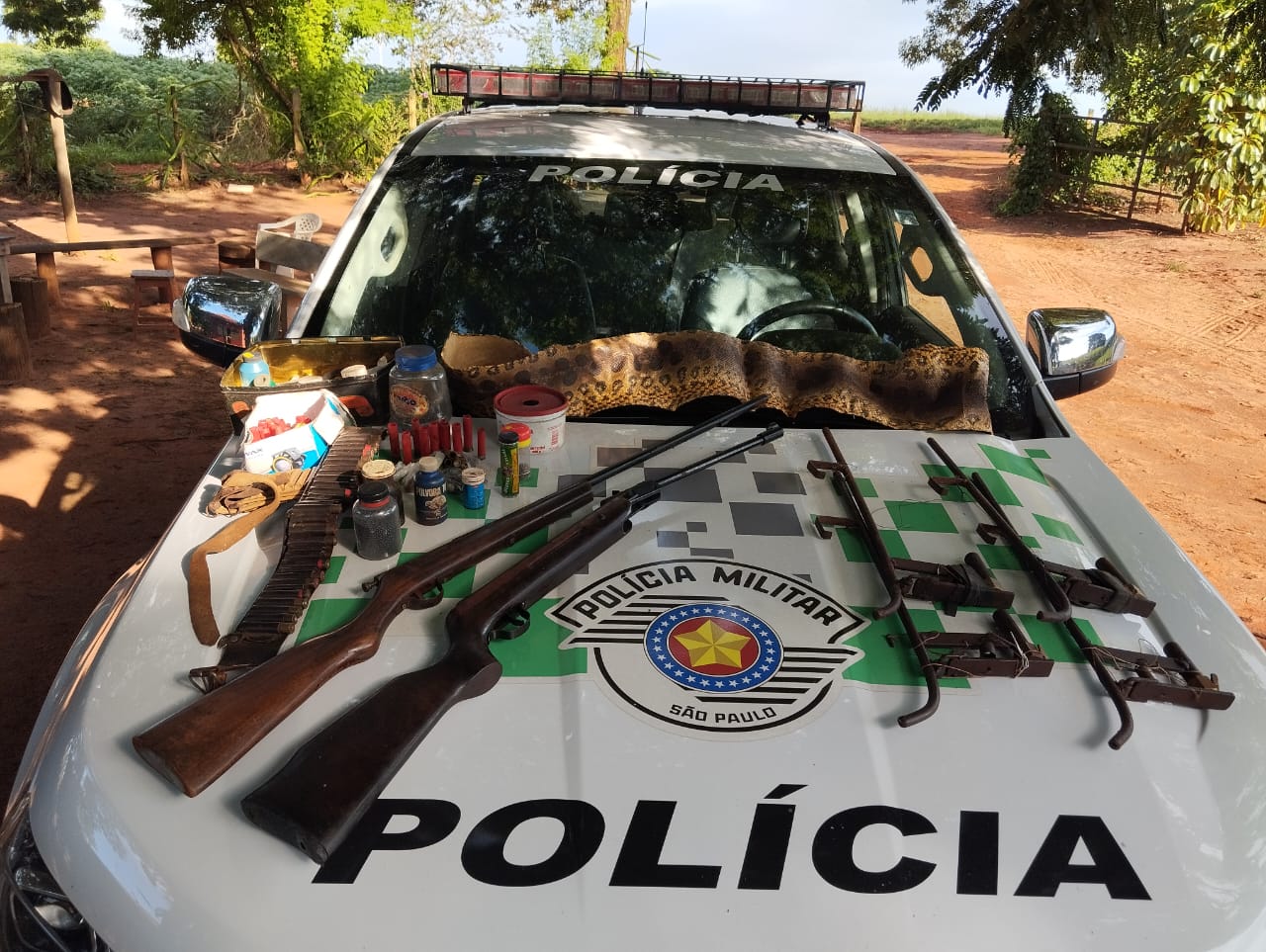 Em 30 de janeiro de 2024, equipe da Polícia Militar Ambiental de São Carlos-SP, durante cumprimento de mandado de busca e apreensão que versa sobre caça ilegal e condutas equiparadas, esta equipe da Polícia Militar Ambiental se deslocou até a área rural do município de Ribeirão Bonito/SP, na Fazenda Ipê, para atendimento da demanda. Pelo local durante a vistoria foram localizados e apreendidos; 01 espingarda calibre. 32 – sem marca aparente, 01 espingarda de ar comprimido adulterada para arma de fogo – sem marca aparente, 73 munições deflagradas de calibres diversos, 09 munições intactas de calibres diversos, 08 potes contendo chumbo, 03 potes contendo pólvora, 02 potes contendo espoletas, 04 canhãozinhos aptos para uso, 02 baleiros, 01 alçapão, 01 batedeira, 02 redes de caça, 01 espinhel, 30 redes de nylon totalizando 241,8 metros, 04 tarrafas e 01 couro de cobra. Diante dos fatos foi dado voz de prisão ao indiciado por posse ilegal de arma de fogo, sendo ele e os objetos foram conduzidos a Delegacia de Policia de Ribeirão Bonito, onde o Delegado Adriano Callsen Alexandrino ratificou a voz de prisão, bem como efetuou a apreensão dos objetos, ficando o indiciado permaneceu à disposição da Justiça.