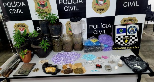 Nesta data (03/09/24), a Polícia Civil de São Paulo, através de equipes da D.I.S.E e contando com apoio de Policiais Civis do 1º/4º Distritos Policiais, durante cumprimento de mandado de busca e apreensão na cidade de Ibaté, precisamente no bairro Jd. América, localizou um liquidificador contendo resquícios de cocaína, 2 facas contendo resquícios de maconha, 17 munições calibre .22, ½ tijolo de “maconha”, 24 porções desta mesma droga, 2 potes de vidro contendo maconha “a granel”, 30 “porções” de “crack”, 401 “ependorfs” contendo cocaína, 15 comprimidos de “ecstasy”, balança de precisão e milhares de “ependorfs” vazios. Ao final, com o apoio do canil da Guarda Municipal de São Carlos, em uma área de mata situada nos fundos do imóvel alvo, foram localizados, ainda, uma plantação contendo 17 pés de maconha, 2 potes de vidro contendo “maconha a granel”, ½ tijolo de “crack” e mais ½ tijolo de maconha. As investigações prosseguem.