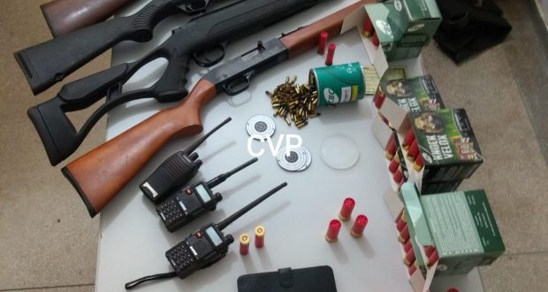 Ao final dos trabalhos de Polícia Judiciária, restaram localizados e apreendidos 03 armas de fogo (espingarda cartucheira “pump” calibre .12; carabina winchester calibre. 22; espingarda cartucheira calibre .32); uma espingarda de ar comprimido; grande quantidade de muniçoes (intactas e deflagradas de calibre. 12); grande quantidade de muniçoes calibre. 22; munições intactas calibre .24 e . 32; celulares e rádios comunicadores.