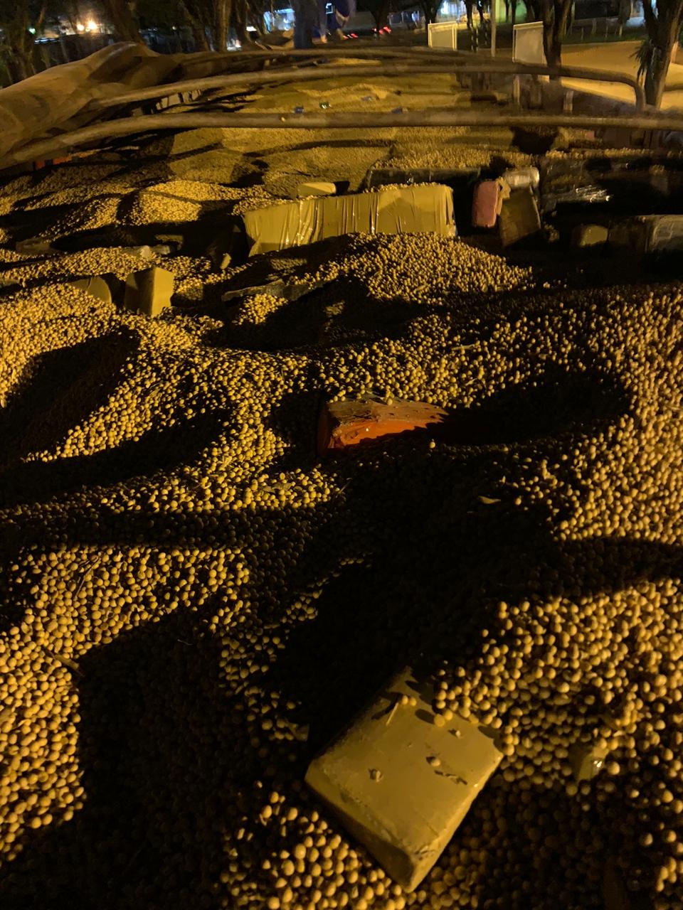 Com a indicação positiva dos cães para a presença de drogas, os caminhões foram levados para o descarregamento da soja, ficando evidente a presença de vários fardos de maconha. Os motoristas de 41 e 39 anos foram conduzidos para a Delegacia de Polícia Federal em Maringá/PR onde foram formalmente presos em flagrante pelo crime tráfico internacional de drogas, cuja pena pode alcançar 15 anos de prisão.