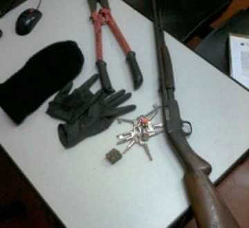 Foram localizadas luvas, touca e a espingarda. O suspeito não foi localizado.